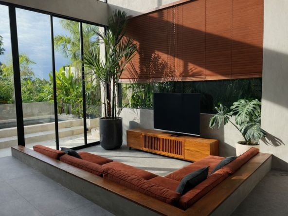 The ground floor reveals an open-plan living and dining area enhanced by double-volume ceilings and extensive glazing that invites natural daylight throughout the home. A sleek and fully fitted kitchen anchors the ground floor, complemented by a cozy dining nook ideal for both casual dining and entertaining. Indoor greenery has been purposefully integrated, reinforcing the harmony between contemporary design and Bali’s lush environment.