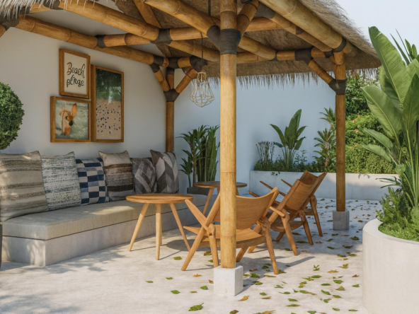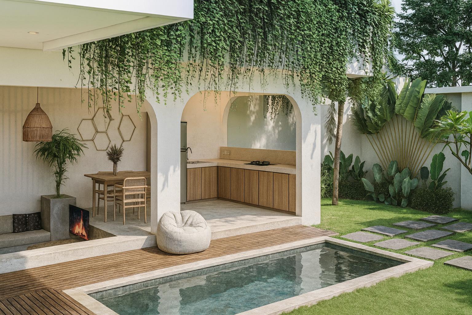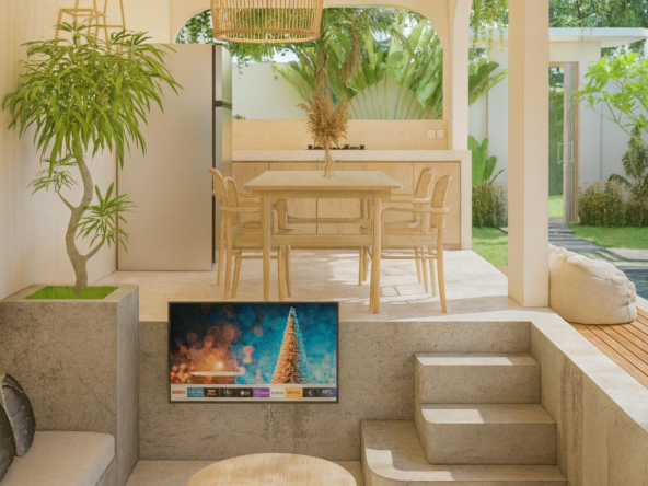 This villa has been crafted to maximize space, comfort, and natural flow. The private pool forms the heart of the home, framed by a serene garden and generous sliding glass doors that fully open the living areas to the outdoors. The open-plan kitchen and dining pavilion—complete with premium finishes and soft neutral palettes—offers an inviting environment for relaxed daily living. Sunken lounge seating creates a stylish entertainment nook, while intelligent tropical landscaping supports privacy and a calming ambience.