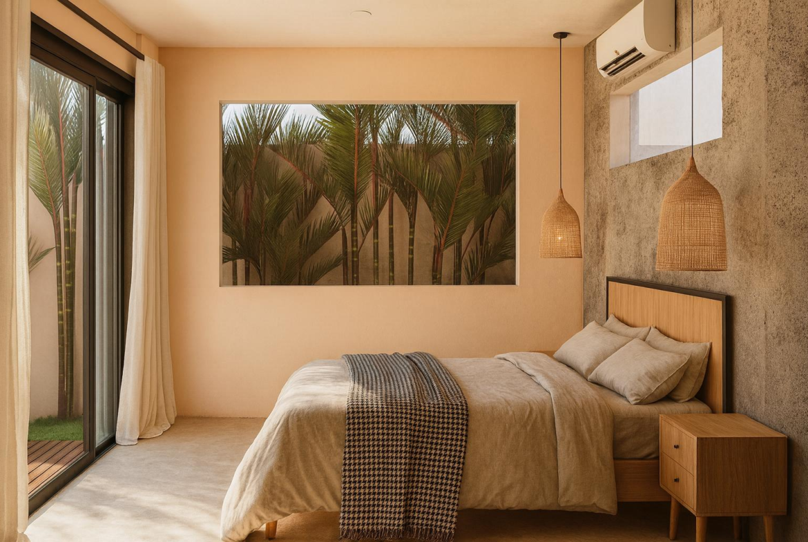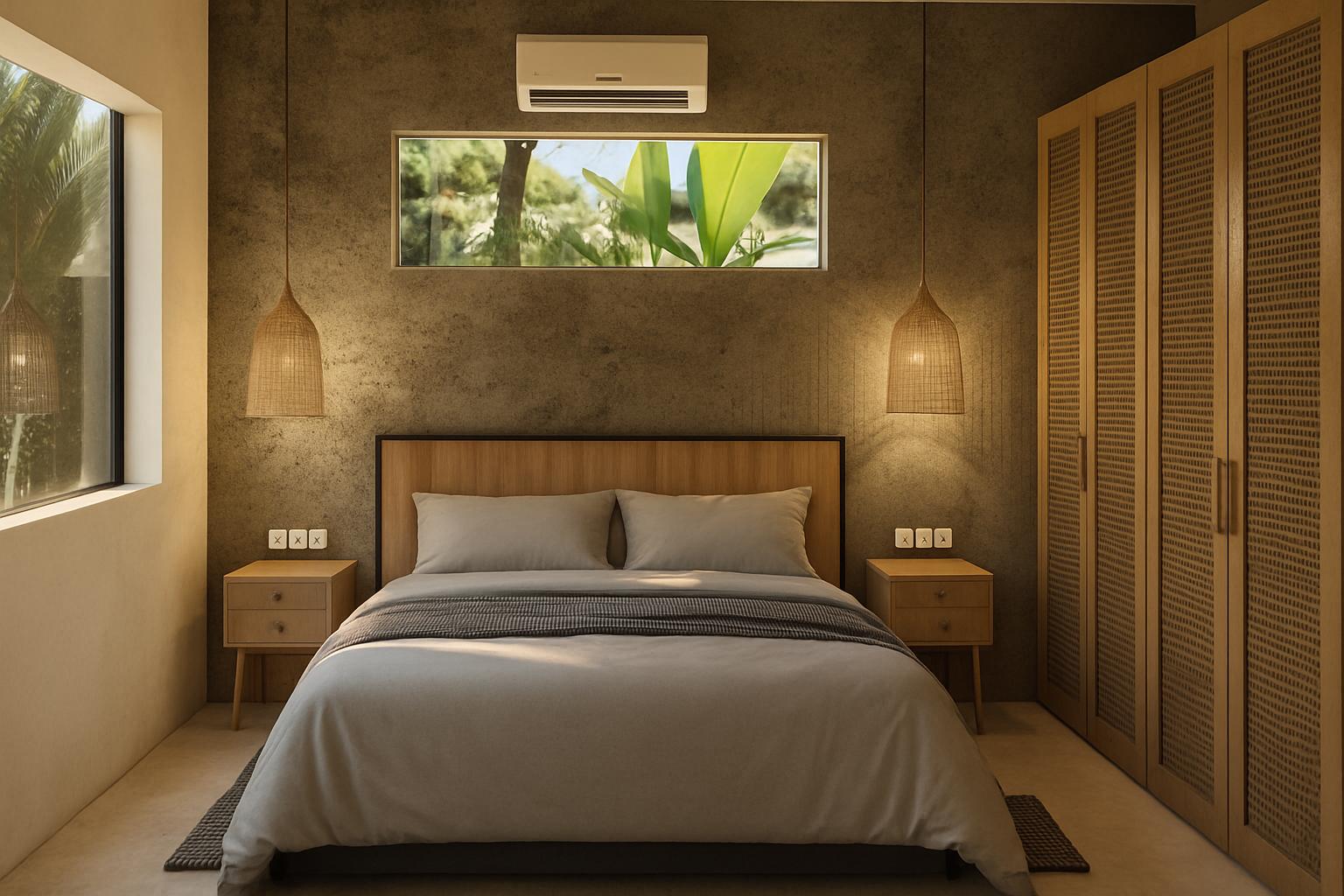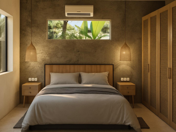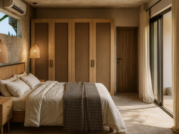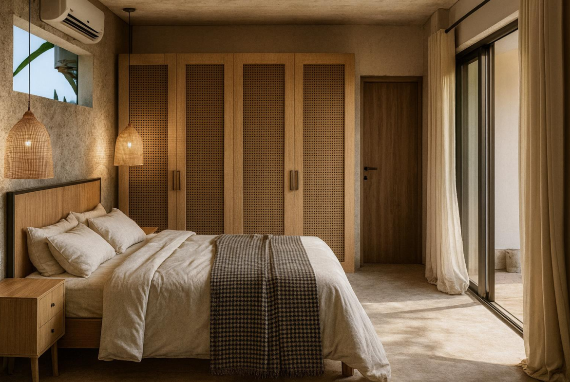 The bedroom is appointed with warm timber cabinetry and softly textured surfaces, elevating everyday comfort into a boutique luxury experience and a modern smart bathroom.