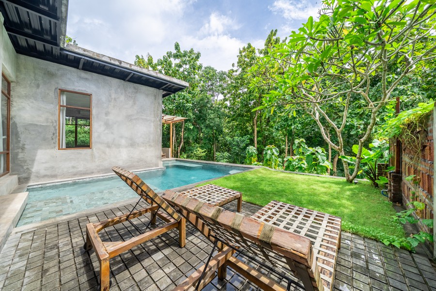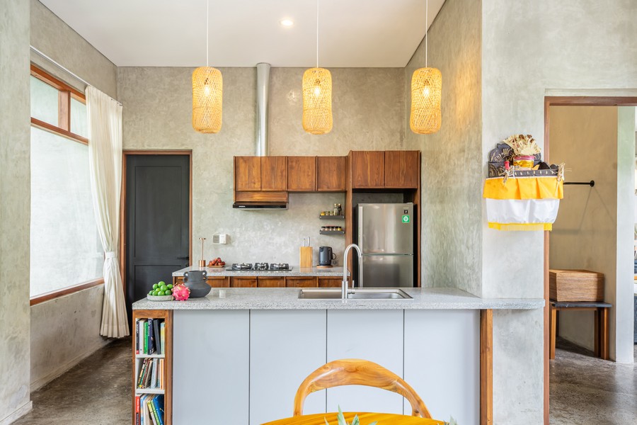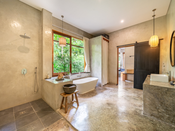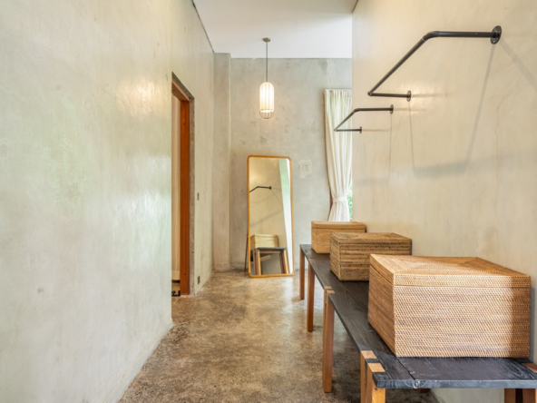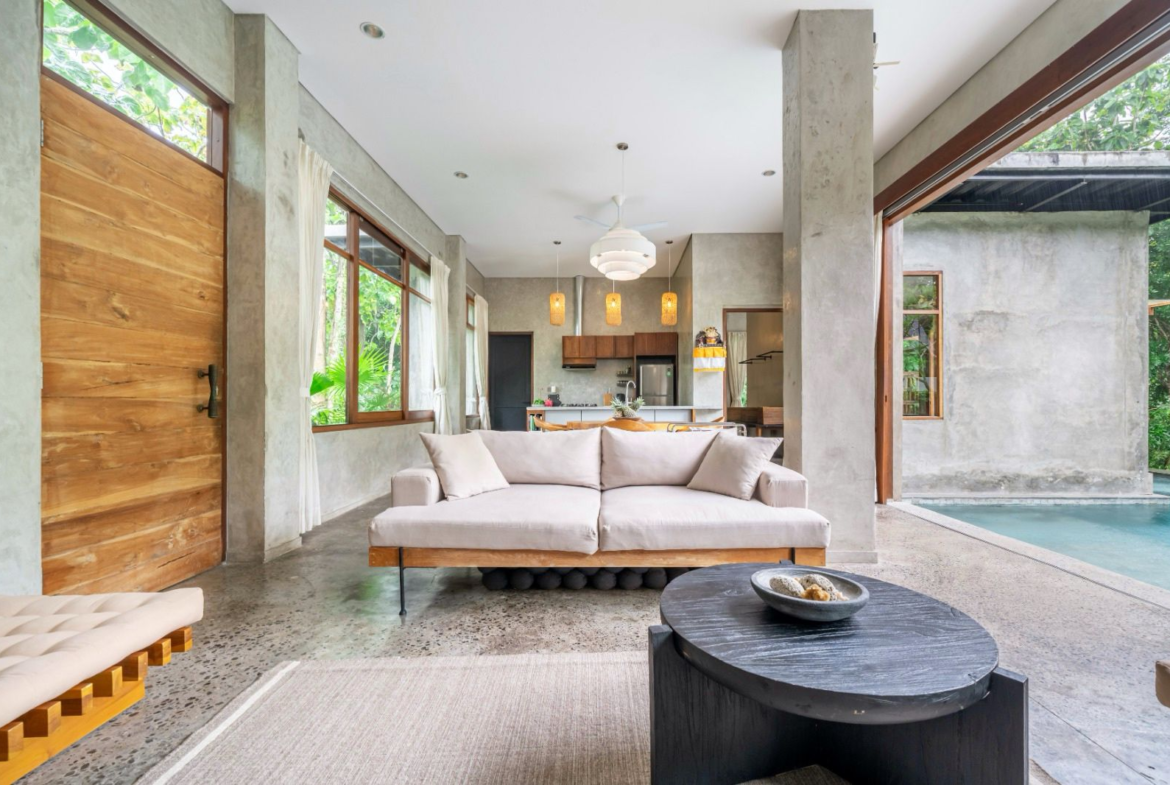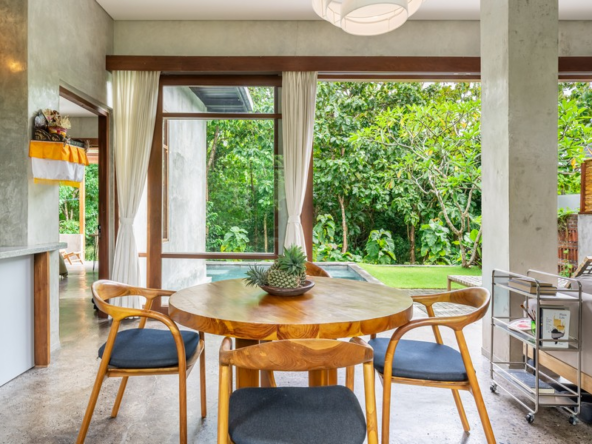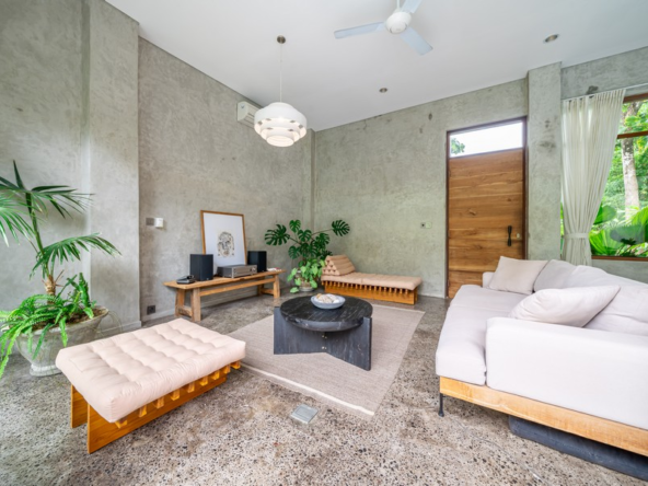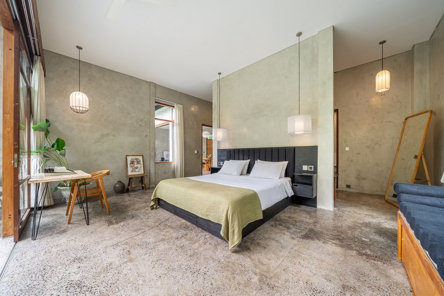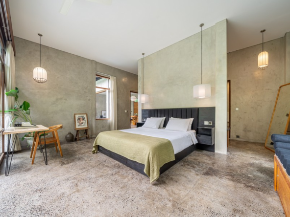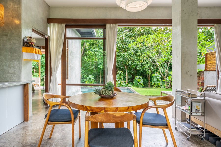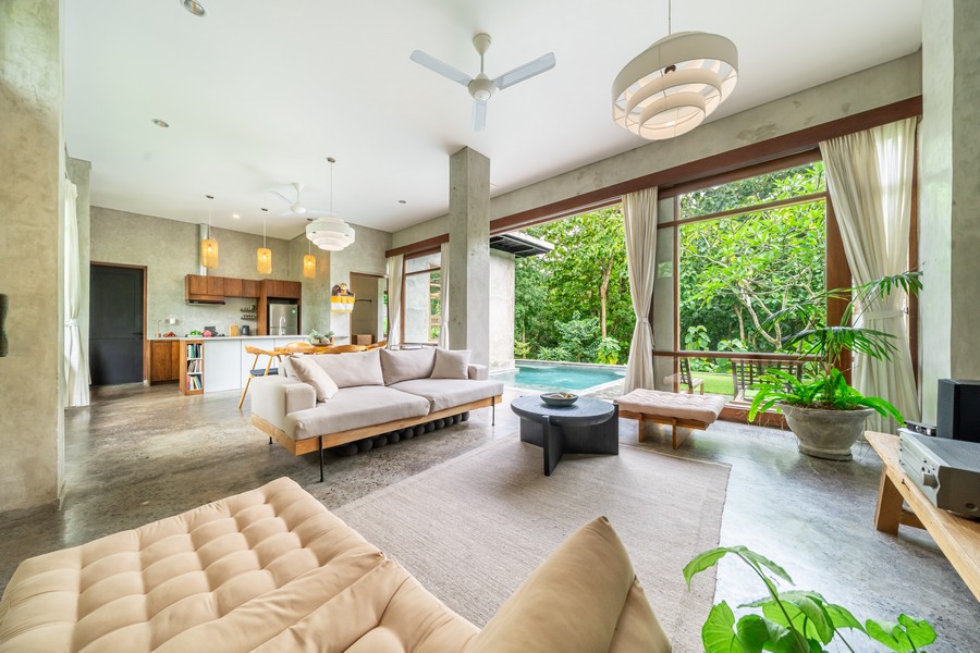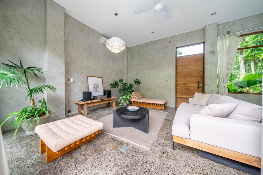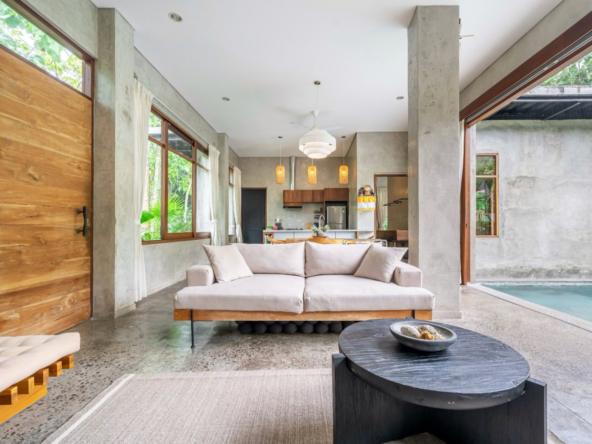 Designed across a single level, the villa blends raw concrete textures with warm timber accents and expansive glazing to create a seamless indoor–outdoor flow. The open-plan living and dining area connects directly to a private garden and swimming pool, allowing natural light and tropical breezes to shape the atmosphere throughout. The interiors are calm and refined, striking a balance between modern minimalism and relaxed island living.