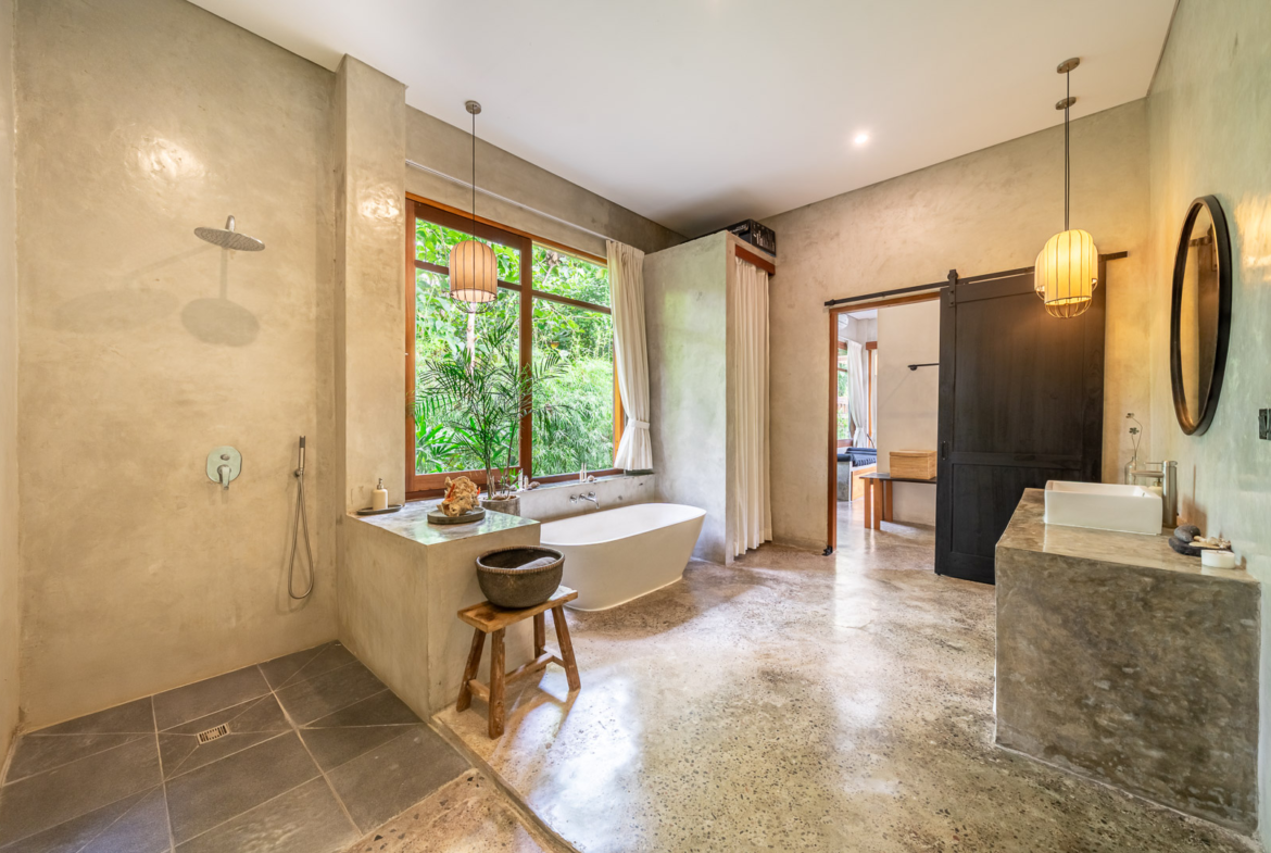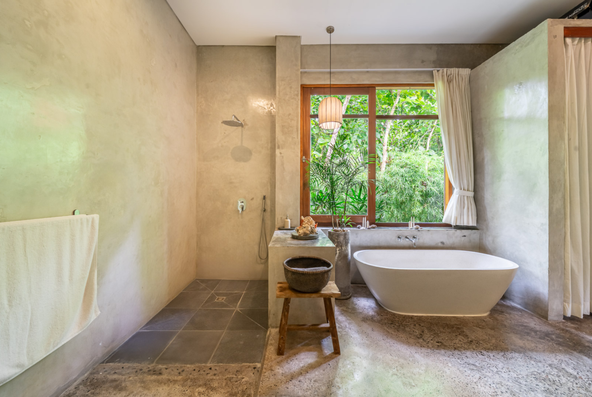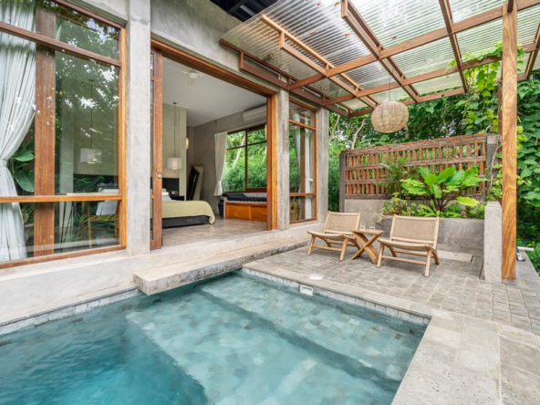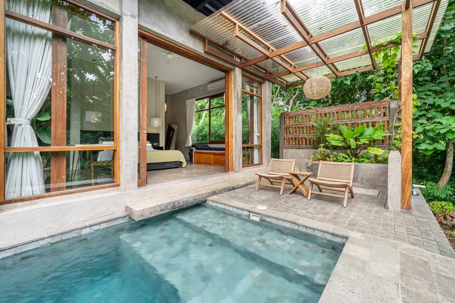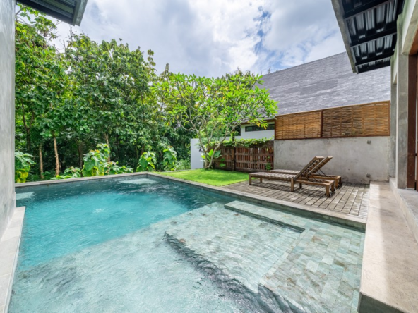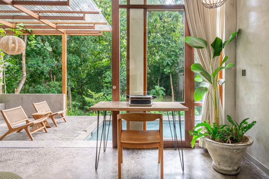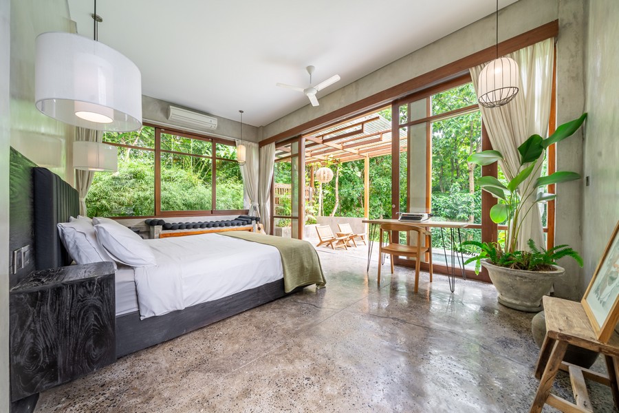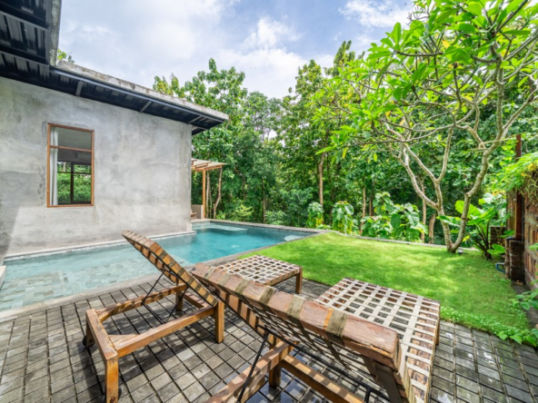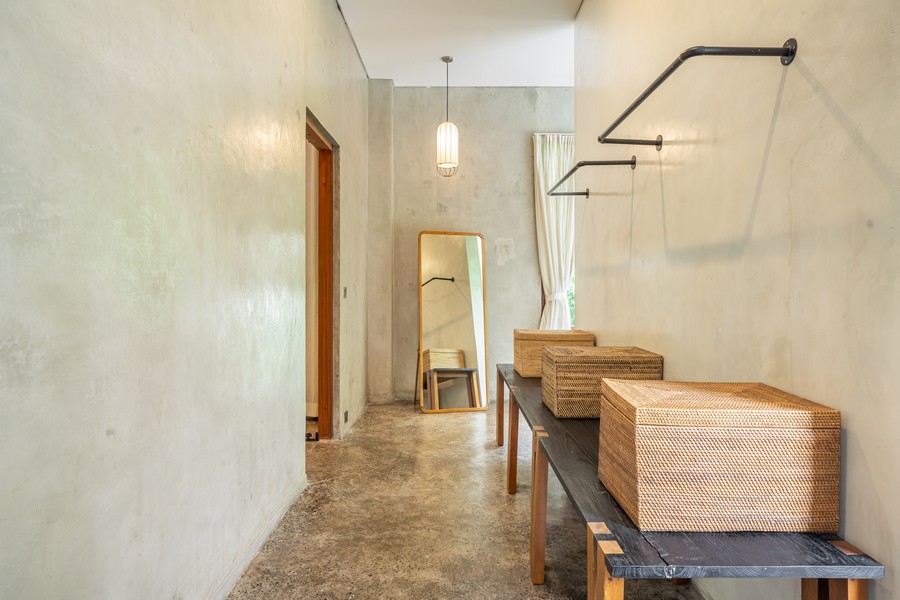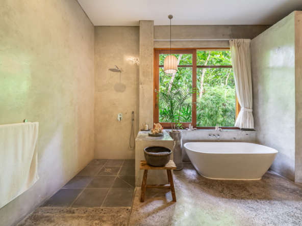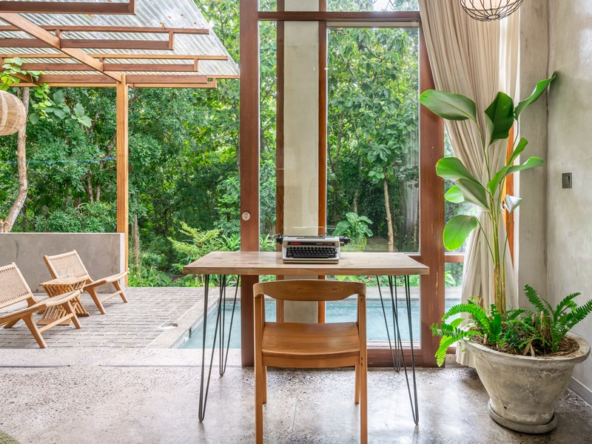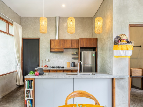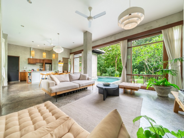 Designed across a single level, the villa blends raw concrete textures with warm timber accents and expansive glazing to create a seamless indoor–outdoor flow. The open-plan living and dining area connects directly to a private garden and swimming pool, allowing natural light and tropical breezes to shape the atmosphere throughout. The interiors are calm and refined, striking a balance between modern minimalism and relaxed island living.