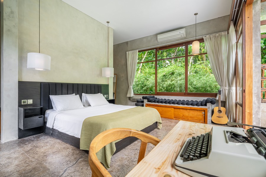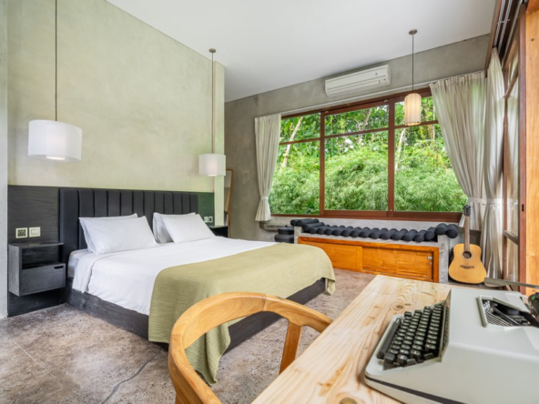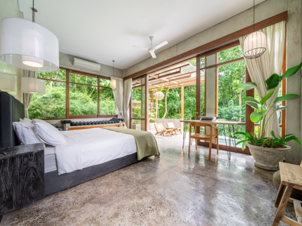 The spacious bedroom functions as a tranquil sanctuary, complete with large windows overlooking lush greenery and a boutique-style bathroom finished with clean lines and soft lighting. Every detail has been considered to ensure comfort while maintaining a timeless aesthetic that will age gracefully.