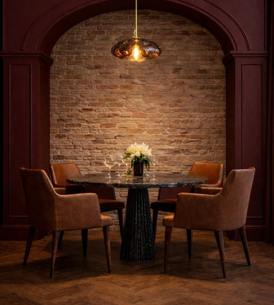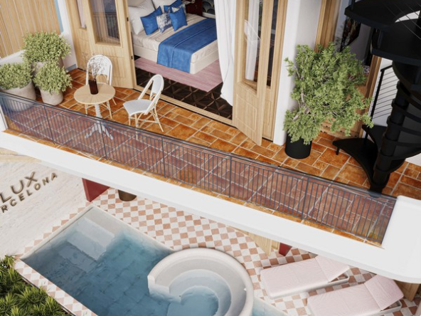 The ground floor features a bright open-plan living and kitchen area that flows seamlessly onto a beautifully designed terrace surrounded by lush landscaping, creating an ideal space for relaxing or entertaining. Inside, natural stone, wood textures, and soft lighting bring warmth and character to the interiors.