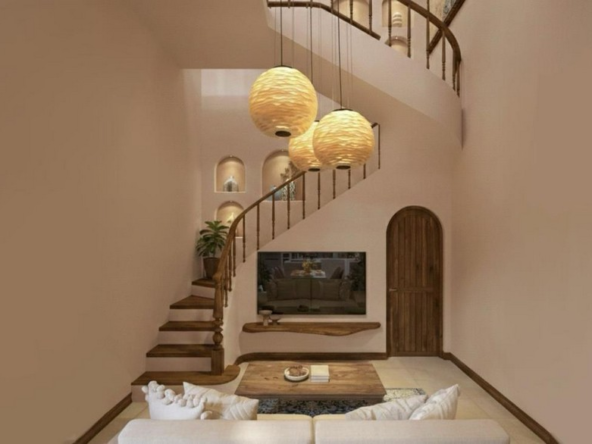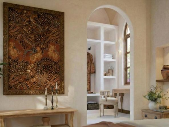 Discover a refined two-bedroom villa in the heart of Bingin, where Mediterranean elegance meets warm tropical character in one of Uluwatu’s most desirable coastal enclaves. Inspired by Spanish design and shaped by Indonesian craftsmanship, the villa features soft arches, Tegel Kunci tiles, batik-inspired detailing, handcrafted timber joinery, and patterned flooring that give it a strong and highly memorable identity. One bedroom is positioned on the ground floor alongside the living, dining, and kitchen areas, all flowing seamlessly to the outdoor terrace and private plunge pool.