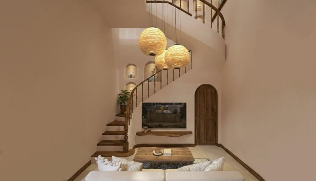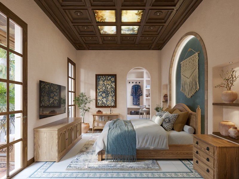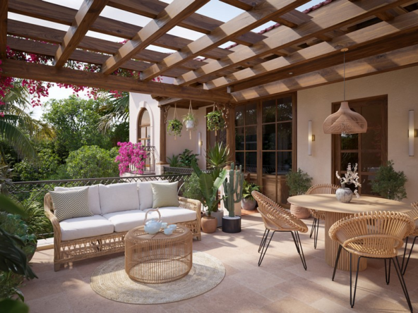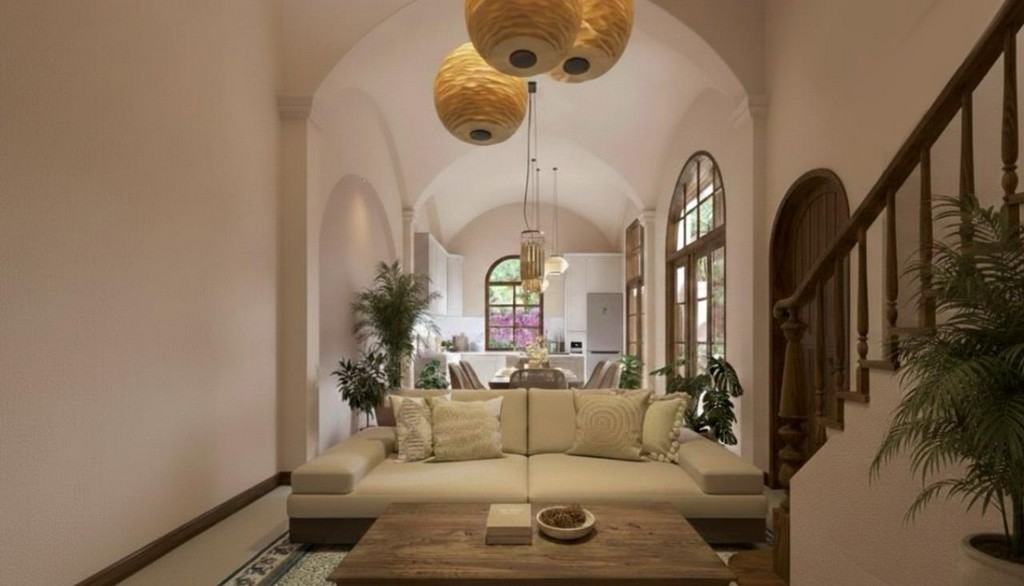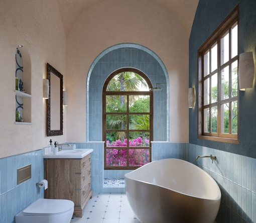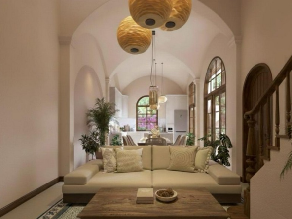 Upstairs, the second bedroom opens onto a charming balcony and rooftop-style terrace, adding another inviting space for lounging or outdoor dining. Soaring ceilings, arched windows, expansive glazing, and spa-inspired bathrooms with sculptural freestanding bathtubs elevate the overall experience and give the home a boutique wellness feel.