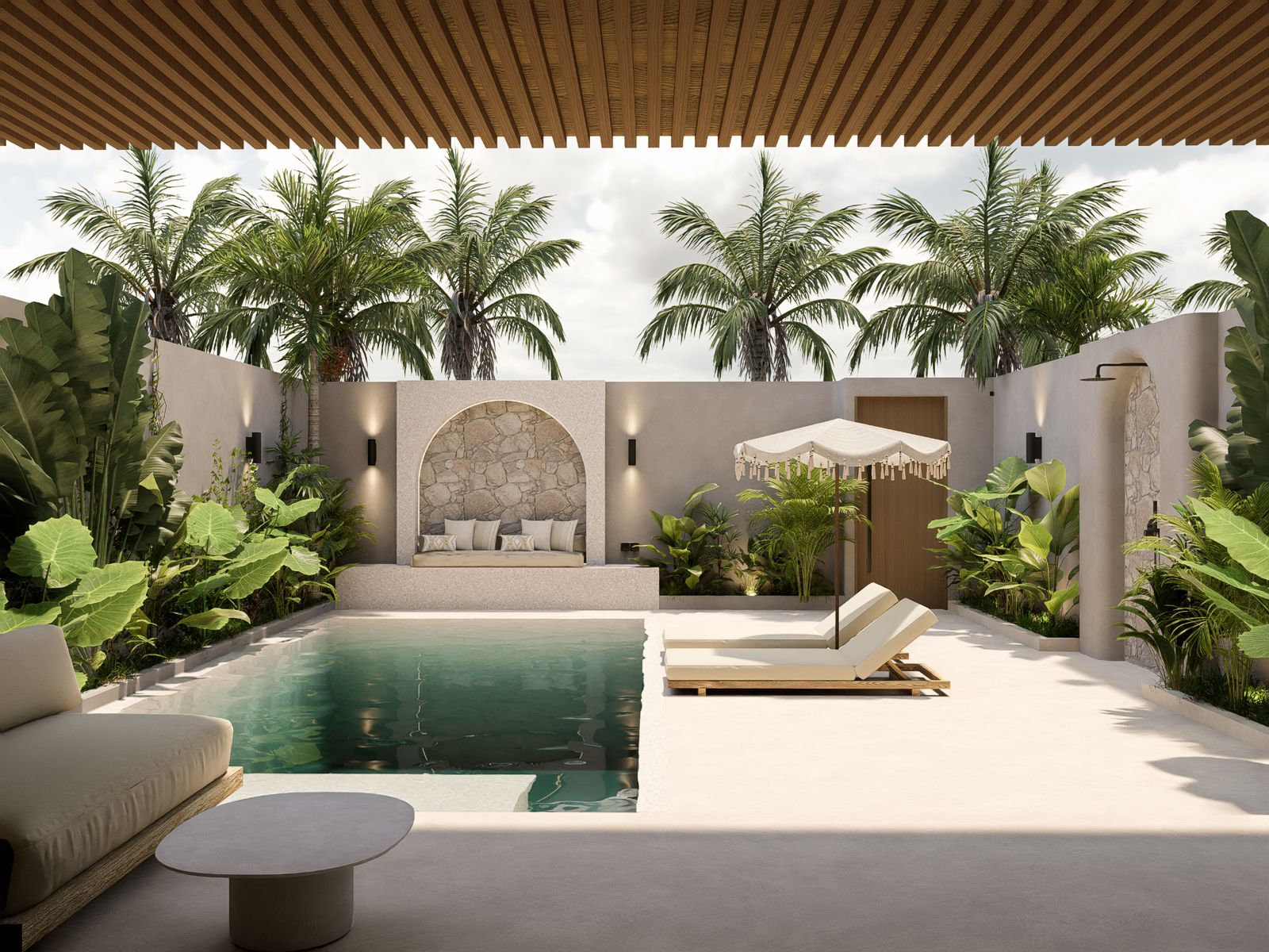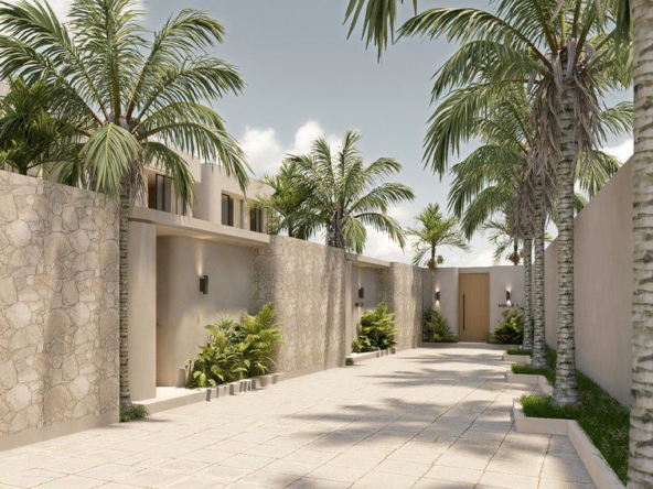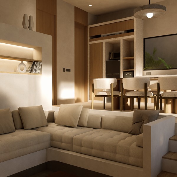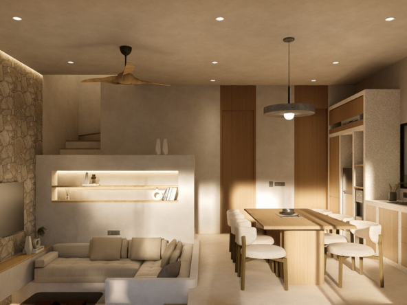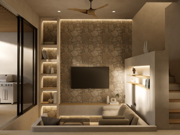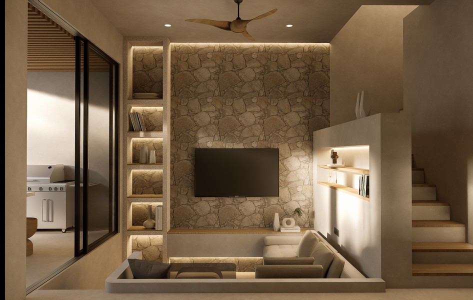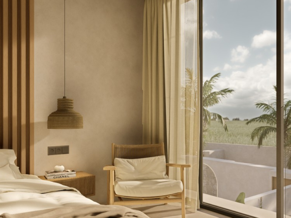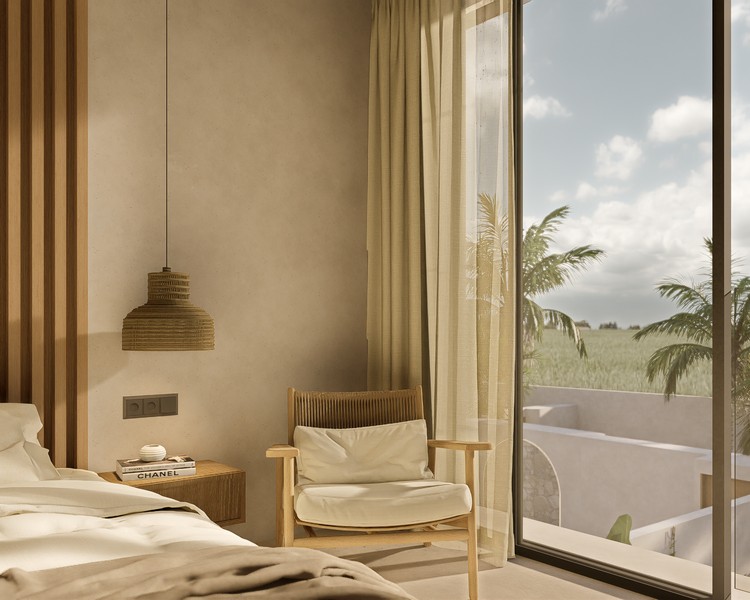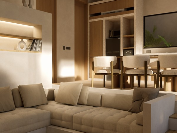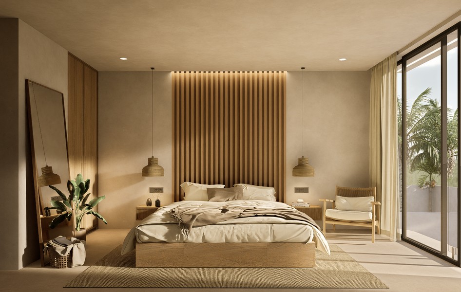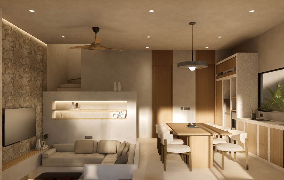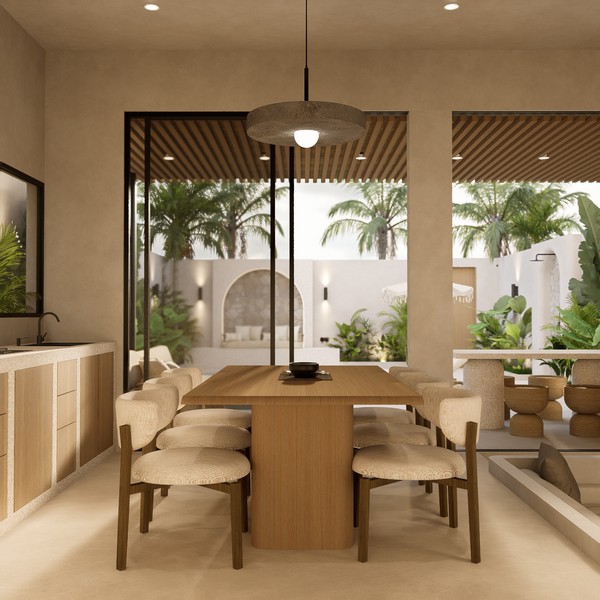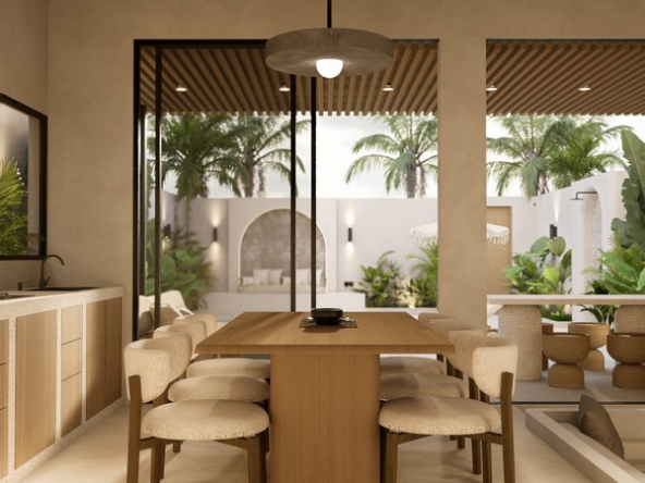 Natural materials, warm timber accents, and stone detailing create a calm, elegant atmosphere throughout the interiors, while large sliding glass doors invite natural light and connect the living spaces with the lush courtyard garden. The villa forms part of a boutique development designed with a cohesive architectural vision, offering privacy, organized access roads, and dedicated parking.