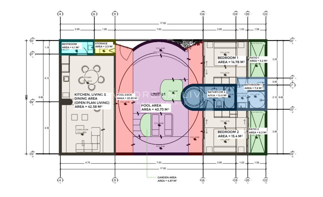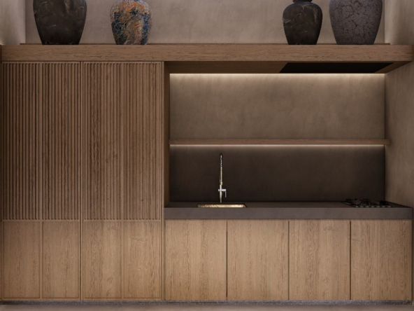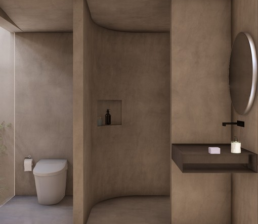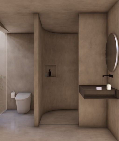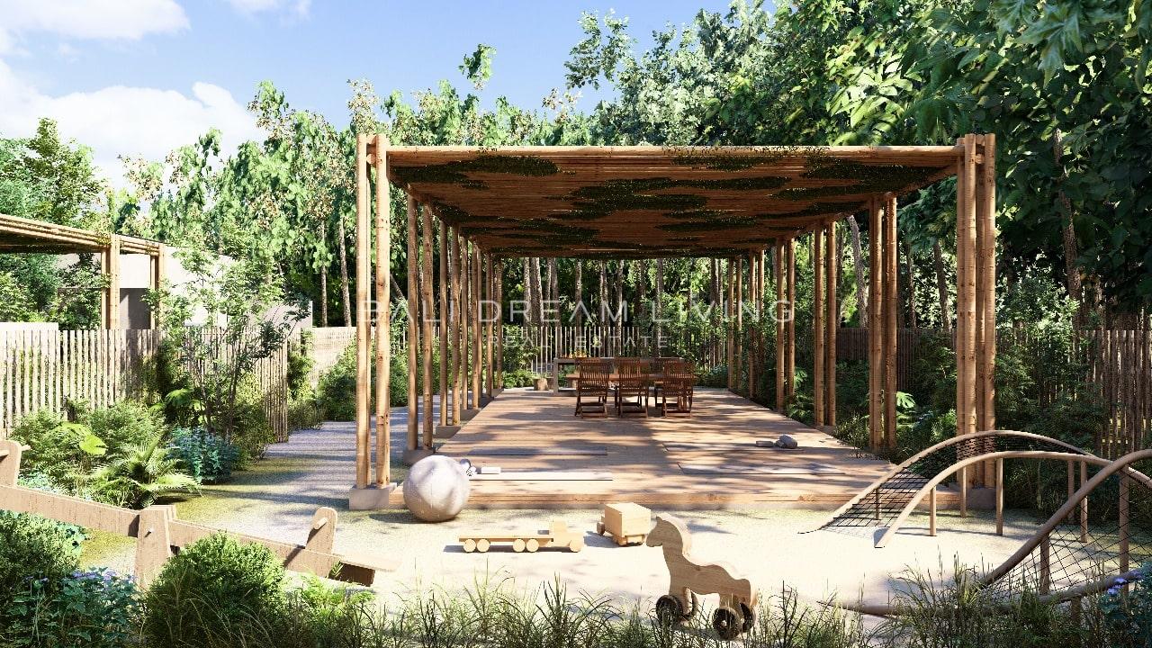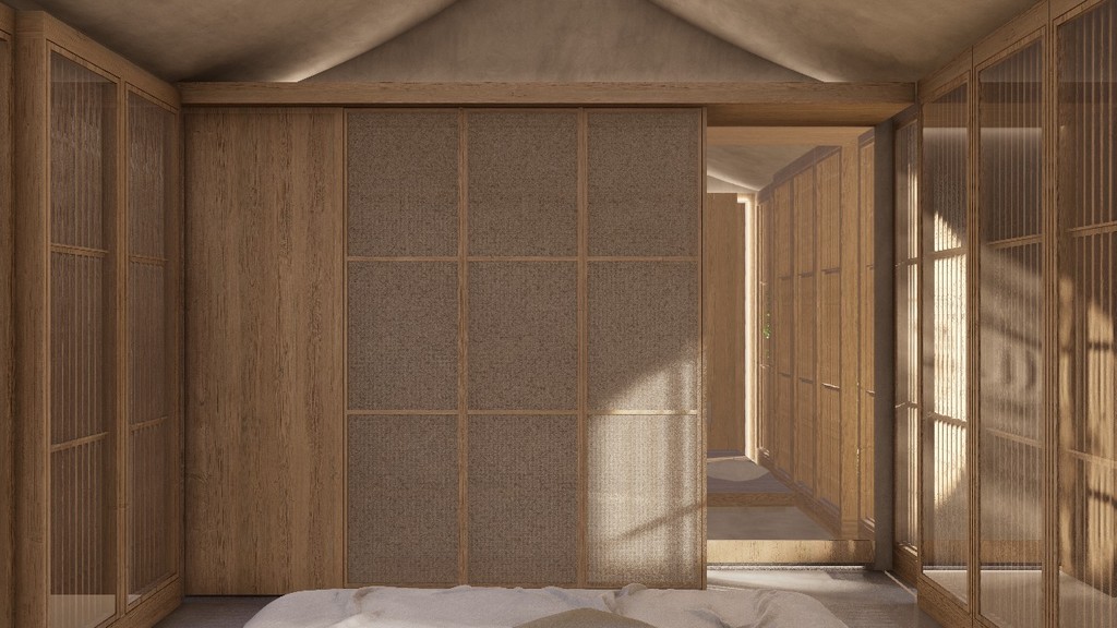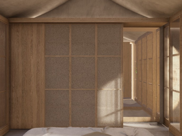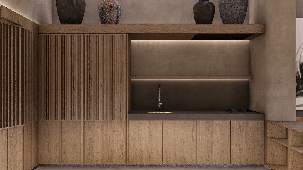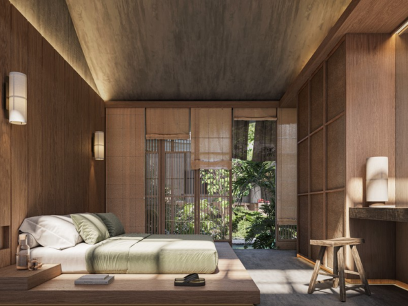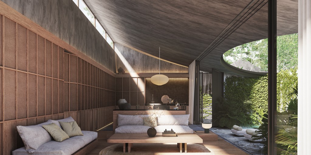 Occupying a land area of 179 square meters with a built-up space of 125 square meters, Villa 1 delivers a seamless balance of space, light, and nature. Its unique design incorporates natural elements such as 20-year-old teak trees, a tranquil pond that transforms into a waterfall during rainfall, and a lush courtyard that enhances the sense of daily serenity. At the heart of the villa lies a bright living and kitchen area, adorned with Japanese textiles, sliding wooden doors, and a cozy platform sofa—crafted for both relaxation and social connection.