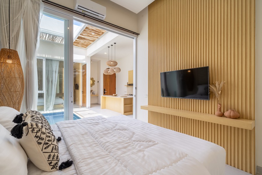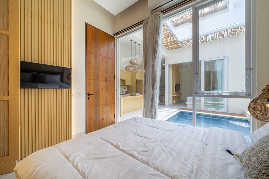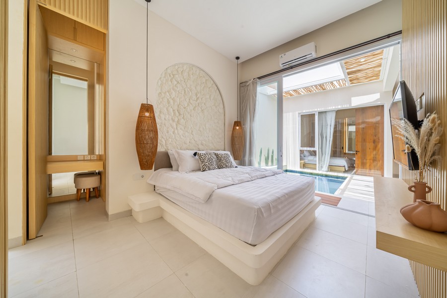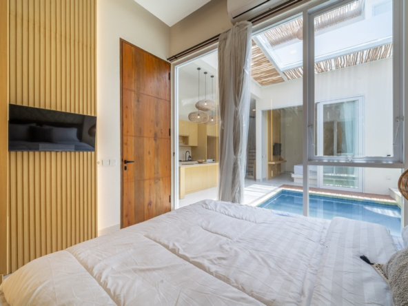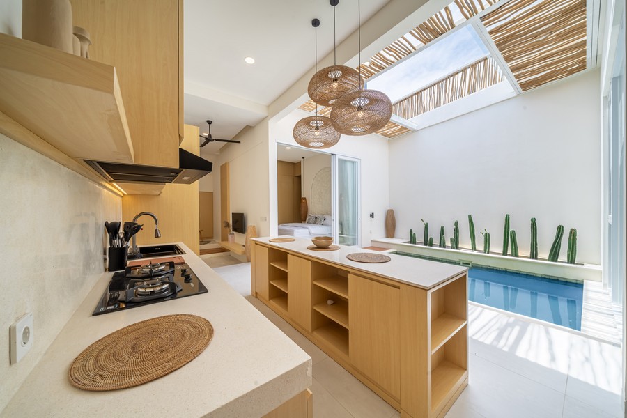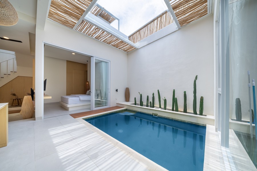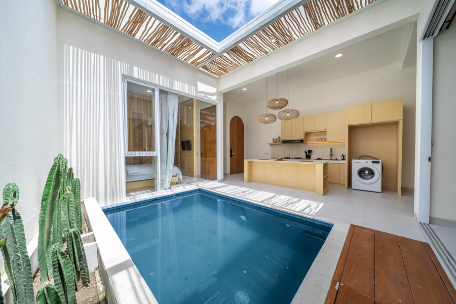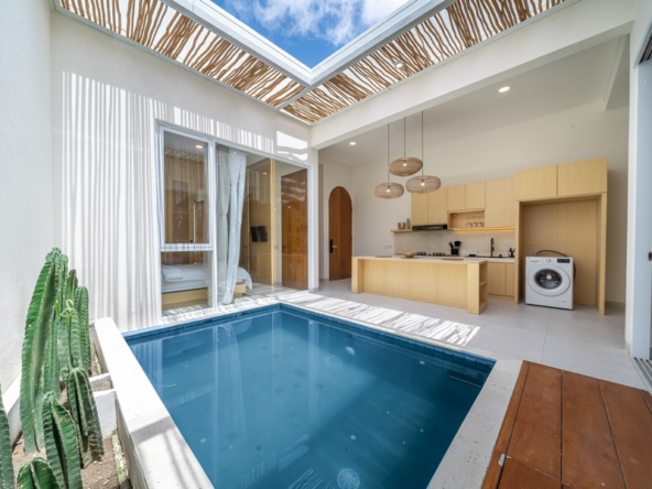 Each villa features a spacious open-plan kitchen and reception area that seamlessly integrates with the private pool, creating an inviting space for relaxation and entertaining. Both double bedrooms come with modern en-suite bathrooms, offering a blend of comfort and style. Additionally, each villa includes its own private carport and an outdoor shower, enhancing the overall convenience and luxury of the property.