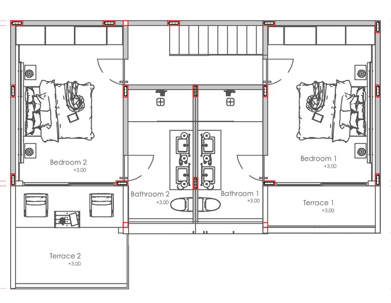 Immerse yourself in Mediterranean-inspired luxury with this exquisite two-bedroom villa, thoughtfully designed to reflect the charm of coastal living while meeting modern demands. Built on a spacious 150m² plot, the ground floor welcomes you with an elegant carport suitable for both car and bike parking, leading to a light-filled, open-plan living area. Here, a stylishly equipped kitchen with an inviting kitchen island and a large dining table set the scene for intimate gatherings. Decorated with bespoke furnishings, including a spacious sofa and a large-screen TV, this area exudes a cozy sophistication.