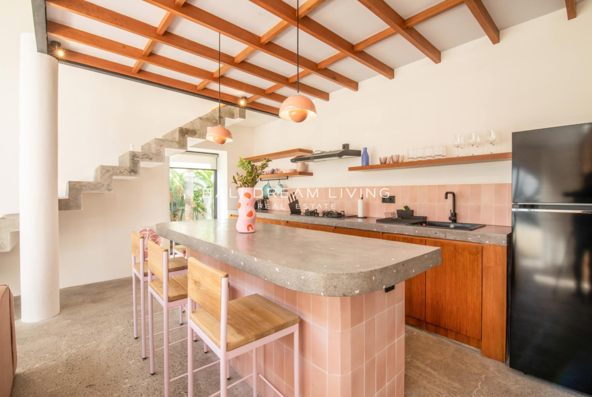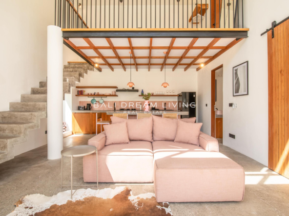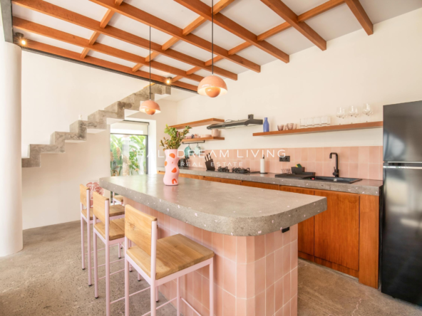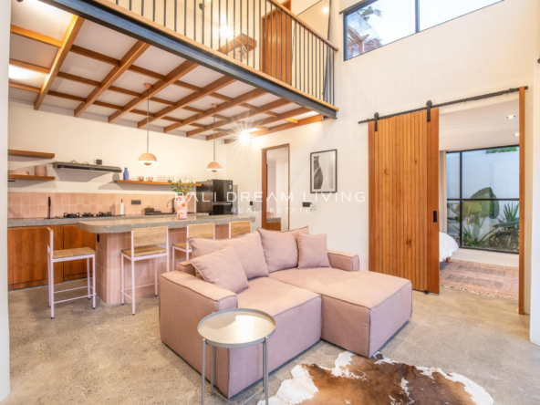 Located in the highly desirable area of Bingin, this beautifully finished two-bedroom villa offers the perfect balance of modern tropical living and sophisticated design. Thoughtfully arranged over two floors, the villa welcomes you with an expansive open-plan living and kitchen area, where soaring vaulted ceilings and abundant natural light create a fresh and airy atmosphere.