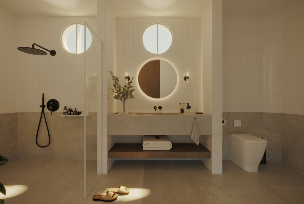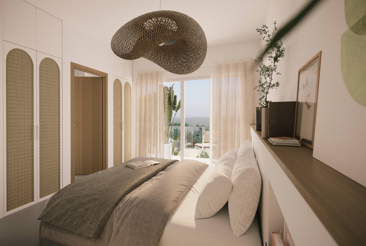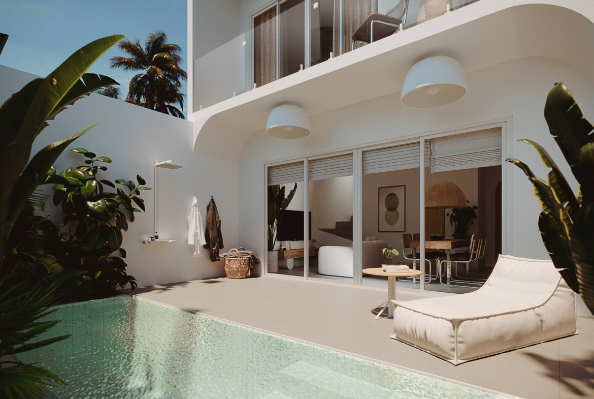 Designed for both leisure and lifestyle, the property is an ideal blend of serene privacy and contemporary design. The villa features a clean, minimalist facade softened by tall coconut palms and tropical landscaping, creating a tranquil oasis from the moment you arrive. A combination of circular windows and soft-edged frames provide a modern Mediterranean touch, while the warm wooden doors welcome you into your private sanctuary. Each unit includes dedicated parking, with convenient access and lush greenery lining the pathways.