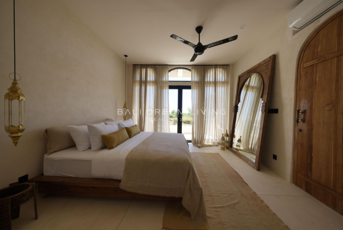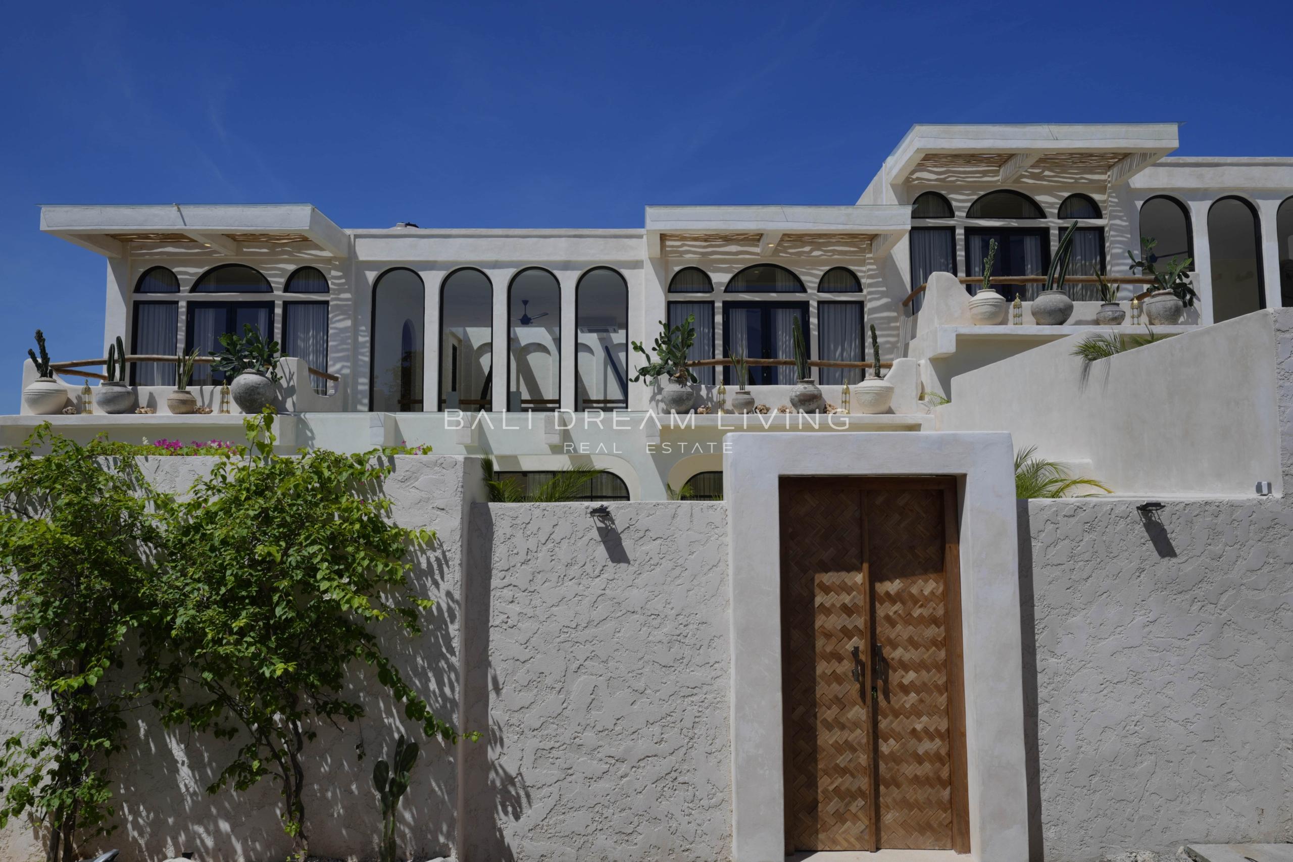 Framed by panoramic Indian Ocean views, this Mediterranean-inspired villa stands out for its breezy architectural character, shaded terrace, and beautifully balanced indoor-outdoor flow. Skylights, expansive glazing, and a sunken lounge bring light and volume into the living space, while decorative arches, wood cabinetry, elegant countertops, and high-spec appliances give the kitchen a more refined, design-led finish.
