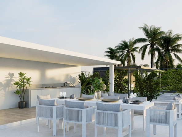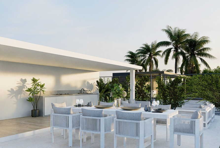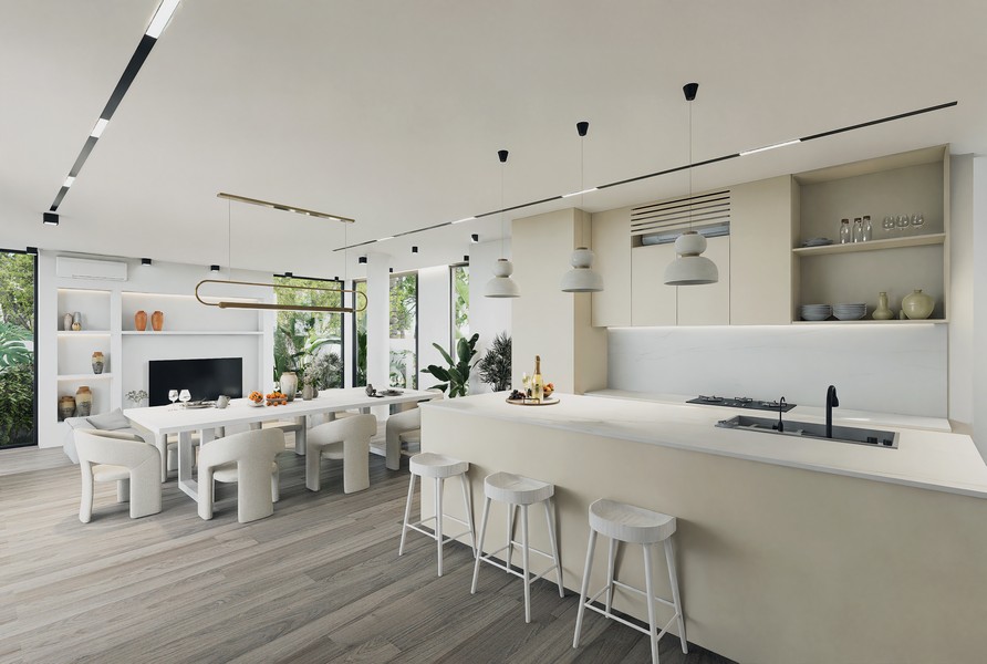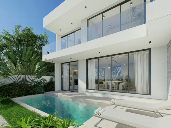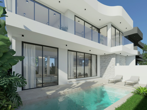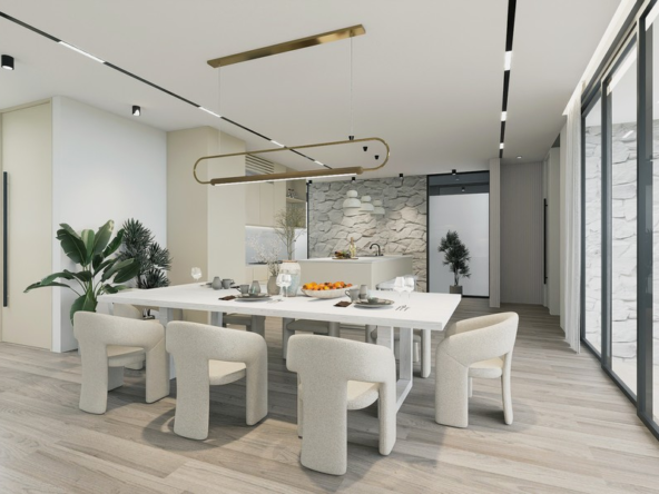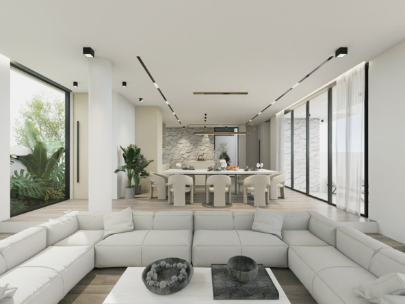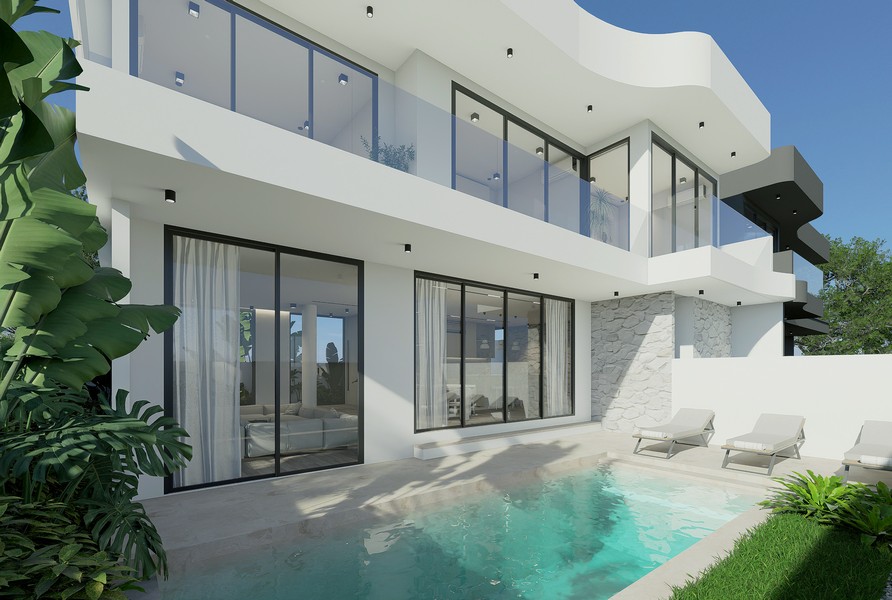 The villa’s pristine white exterior is complemented by expansive interiors, including a grand living room and a stylish open-plan kitchen and dining area that extends to an inviting outdoor deck. The ground floor is meticulously planned to include a sunbed lounge, a sparkling swimming pool, and a lush private garden, creating the perfect setting for relaxation and entertaining.