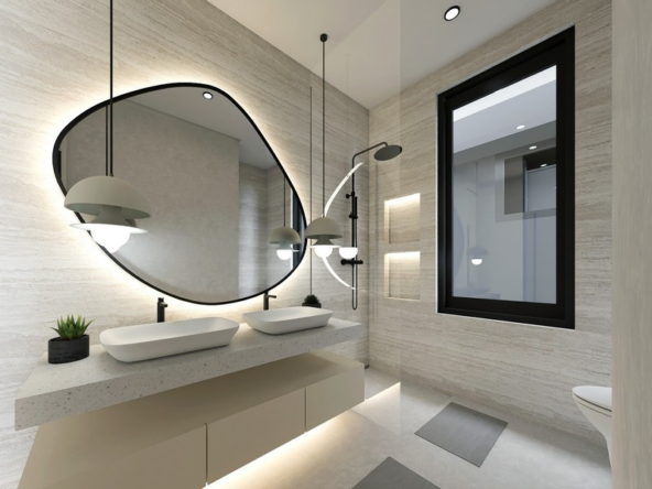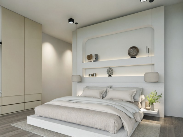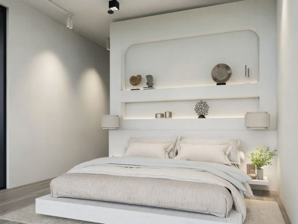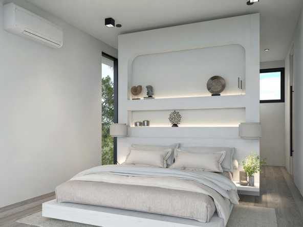 Upstairs, the villa features three exquisitely designed bedrooms, each accompanied by a private ensuite bathroom and wardrobe. The bedrooms are enhanced with private terraces that offer captivating views of the surrounding landscape. The master bedroom exudes luxury, combining spaciousness and an ambiance of calm sophistication.