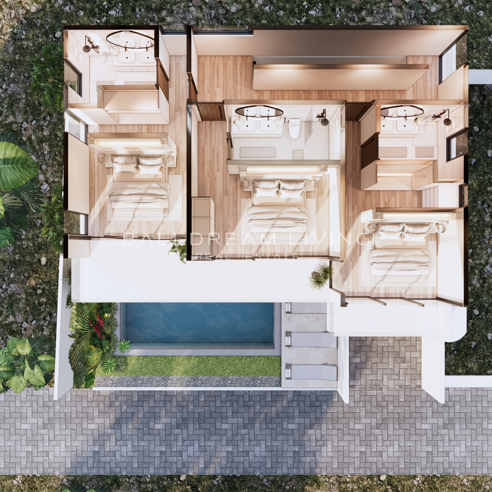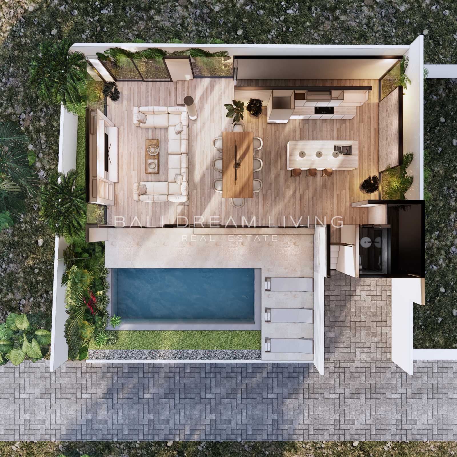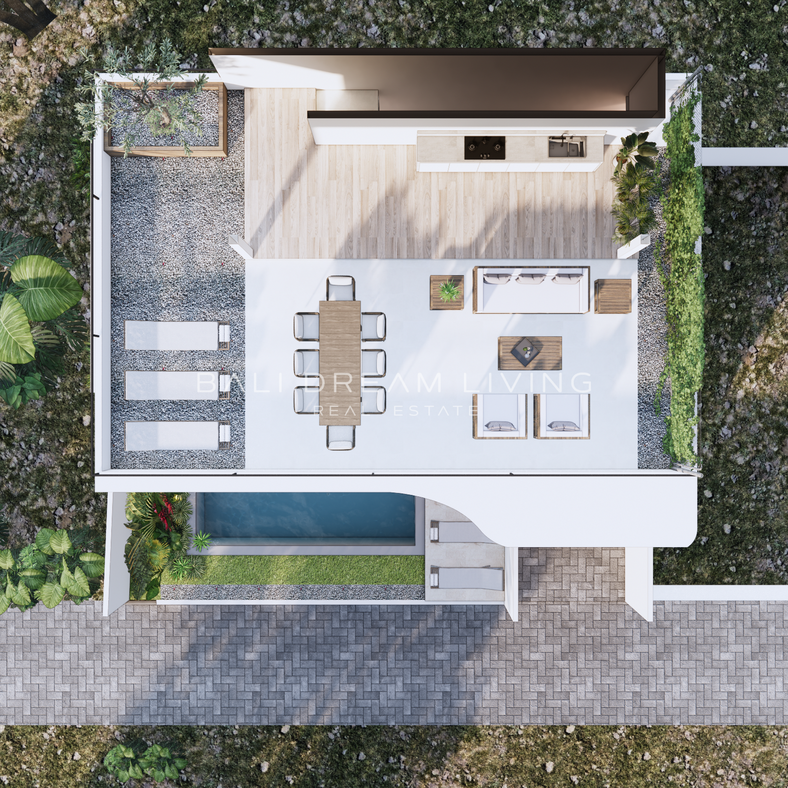 Crowning this architectural masterpiece is a stunning rooftop terrace, an expansive space perfect for soaking in panoramic views of the lush surroundings and Bali’s iconic sunsets. This villa also includes thoughtful details such as a guest toilet, ample storage, and designated parking space, ensuring the highest level of convenience.