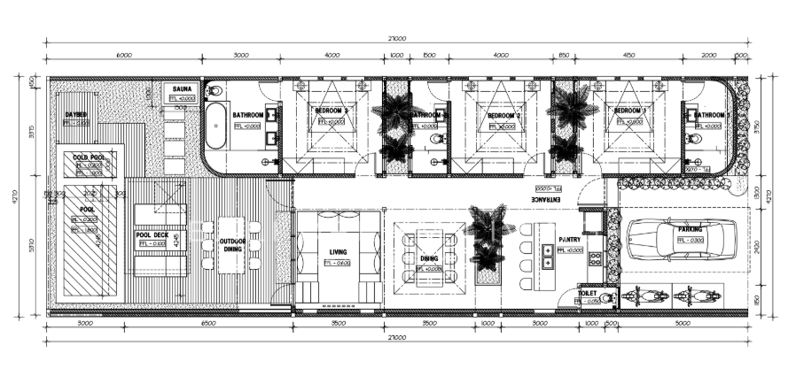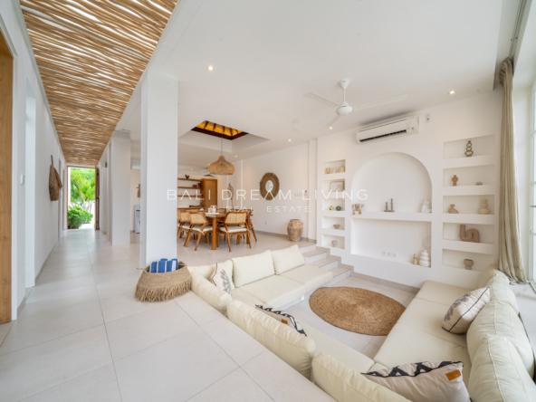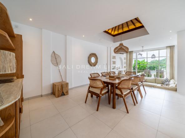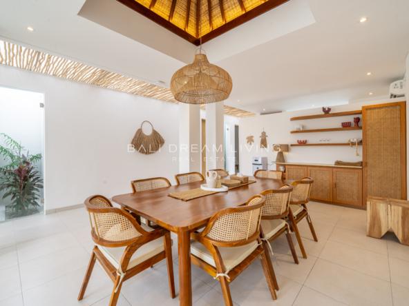 Each of the three spacious bedrooms is accompanied by its own ensuite, creating a seamless flow of comfort and convenience. The sunken lounge, designed to accommodate up to nine guests, invites moments of connection and serenity, while the dining area, seating eight, sets the stage for unforgettable meals. A fully covered poolside pavilion provides an ideal setting for tranquil afternoons, while the villa’s private kitchen offers the option to bring in a personal chef for a tailored culinary experience.