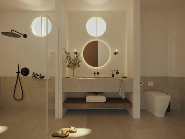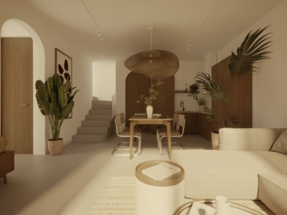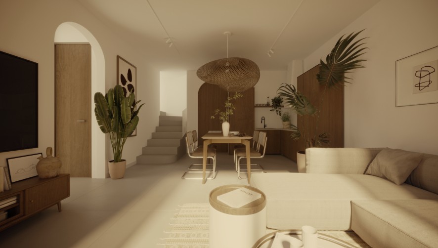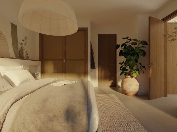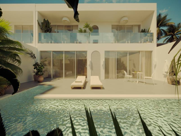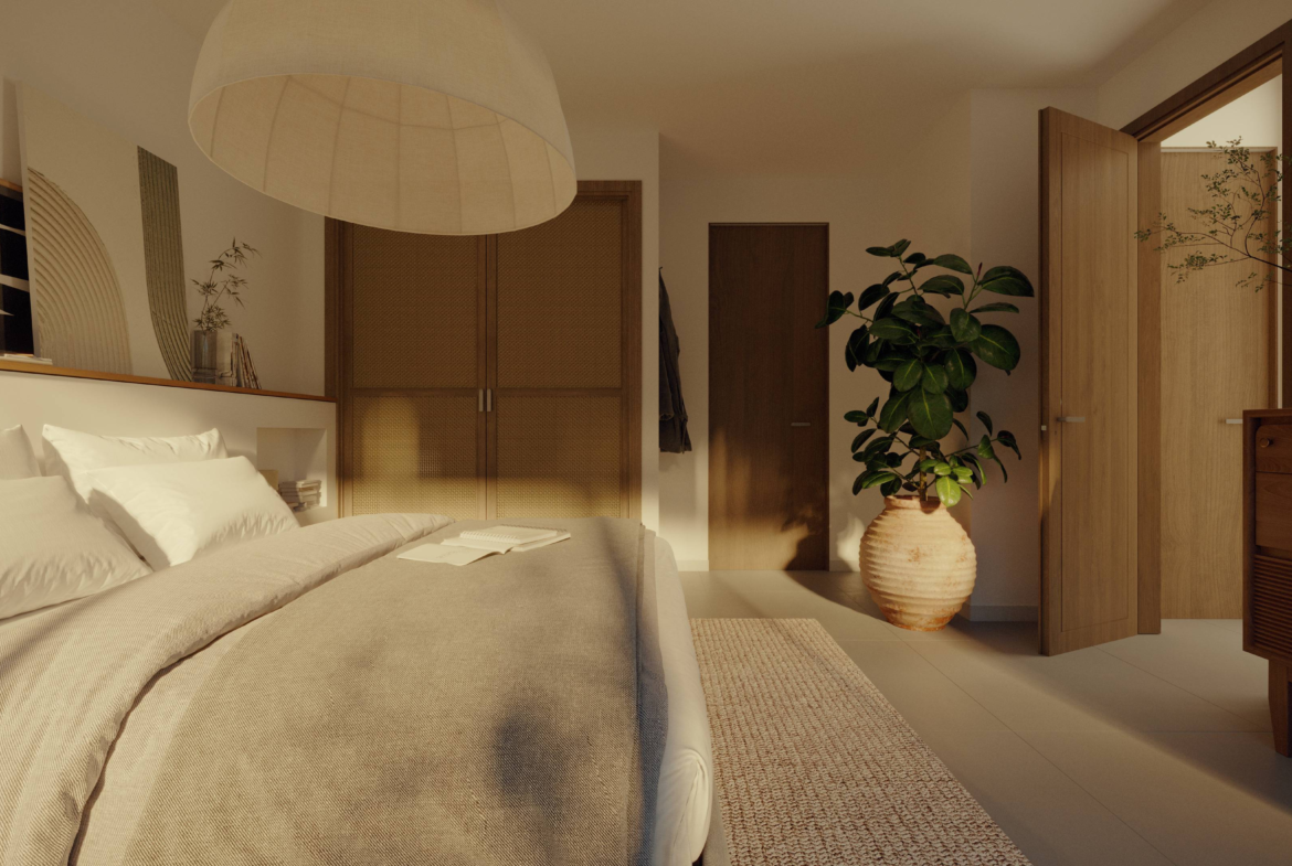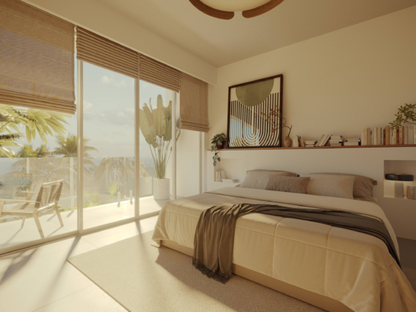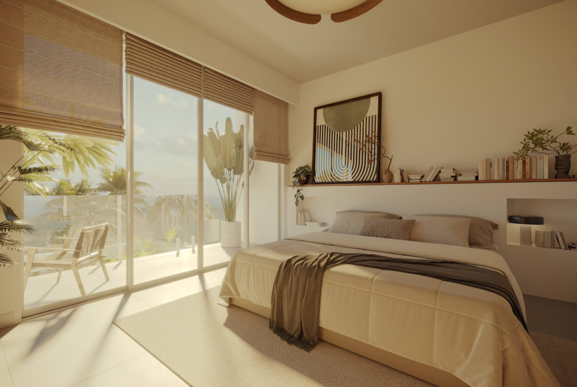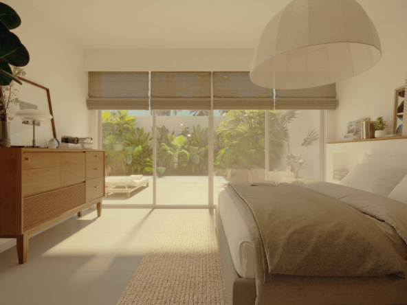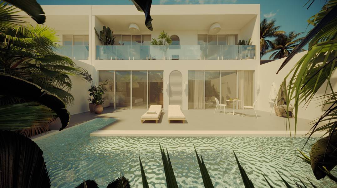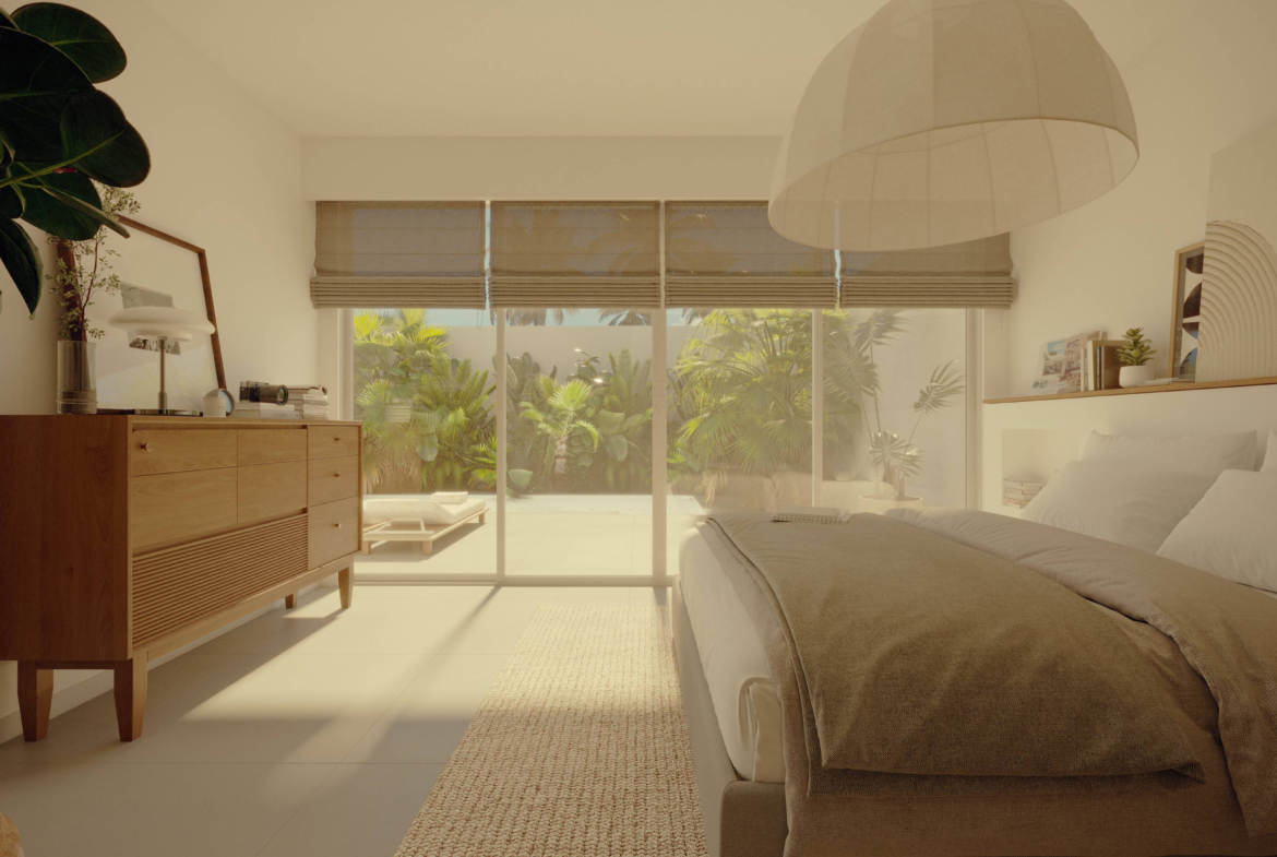 Designed for both leisure and lifestyle, the property is an ideal blend of serene privacy and contemporary design. The villa features a clean, minimalist façade softened by tall coconut palms and tropical landscaping, creating a tranquil oasis from the moment you arrive. A combination of circular windows and soft-edged frames provide a modern Mediterranean touch, while the warm wooden doors welcome you into your private sanctuary. Each unit includes dedicated parking, with convenient access and lush greenery lining the pathways.