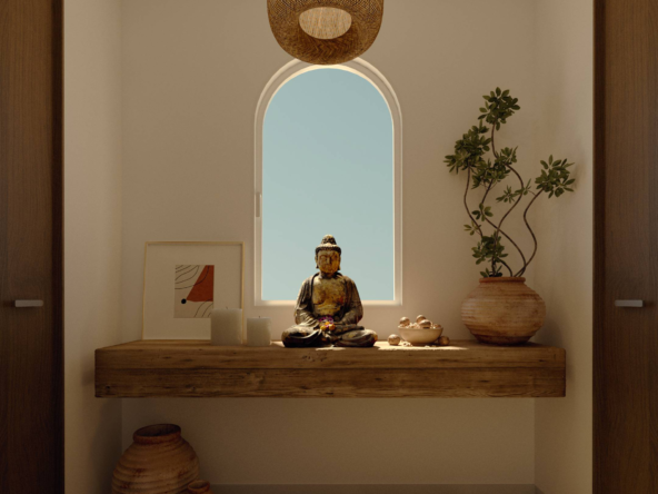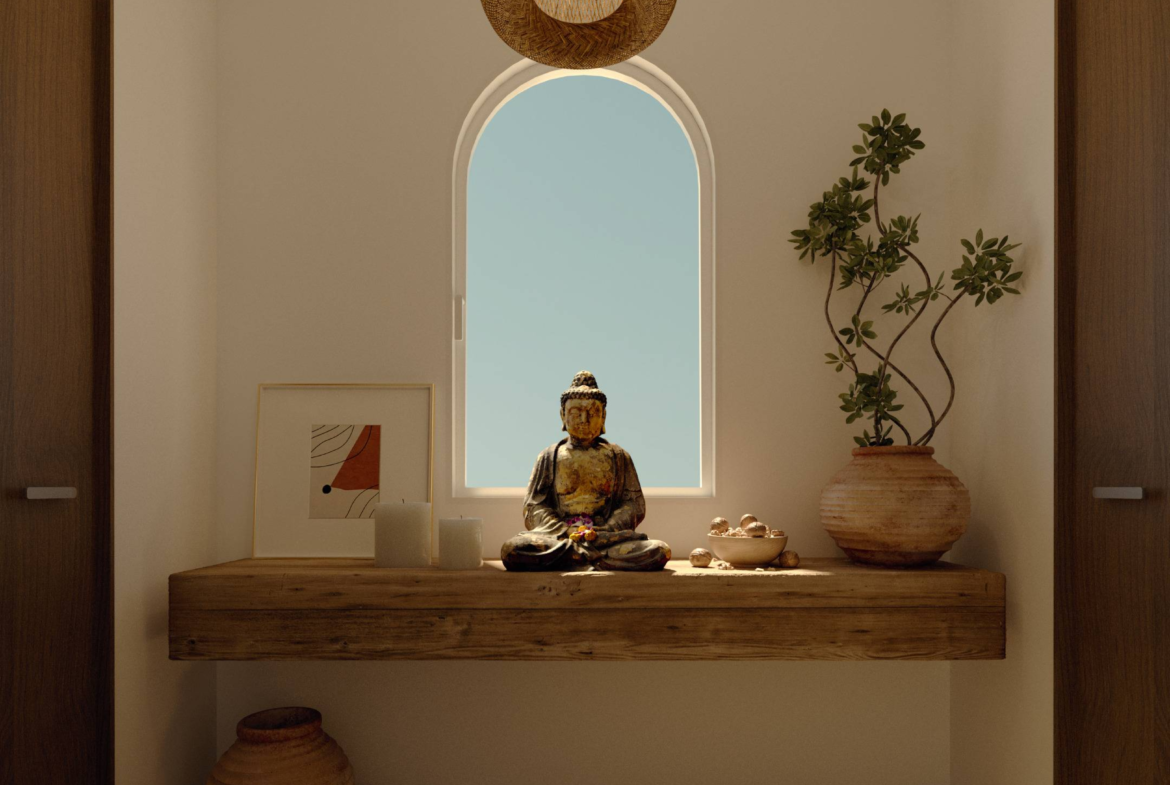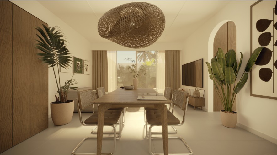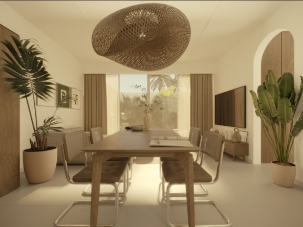 The heart of this villa is its open-plan indoor-outdoor living concept. Step inside and you’ll find interiors that echo organic minimalism — with a neutral color palette, textured natural materials, and soft, inviting tones. The living and dining area is cozy yet sophisticated, adorned with hand-picked decor and subtle Balinese influences.