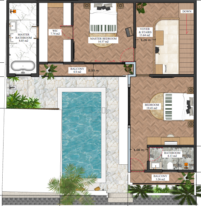 Three well-appointed bedrooms and an additional office provide ample flexibility for families, digital nomads, or those seeking a balance between work and leisure. Each bedroom features modern ensuite bathrooms adorned with marble-patterned tiles and stylish brass fixtures, while the master suite opens directly to the pool terrace—an idyllic spot for a morning coffee or evening unwind.