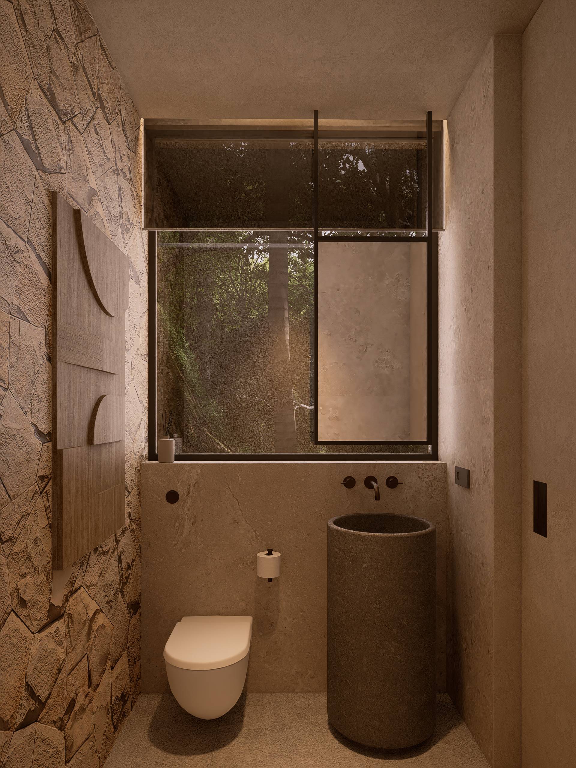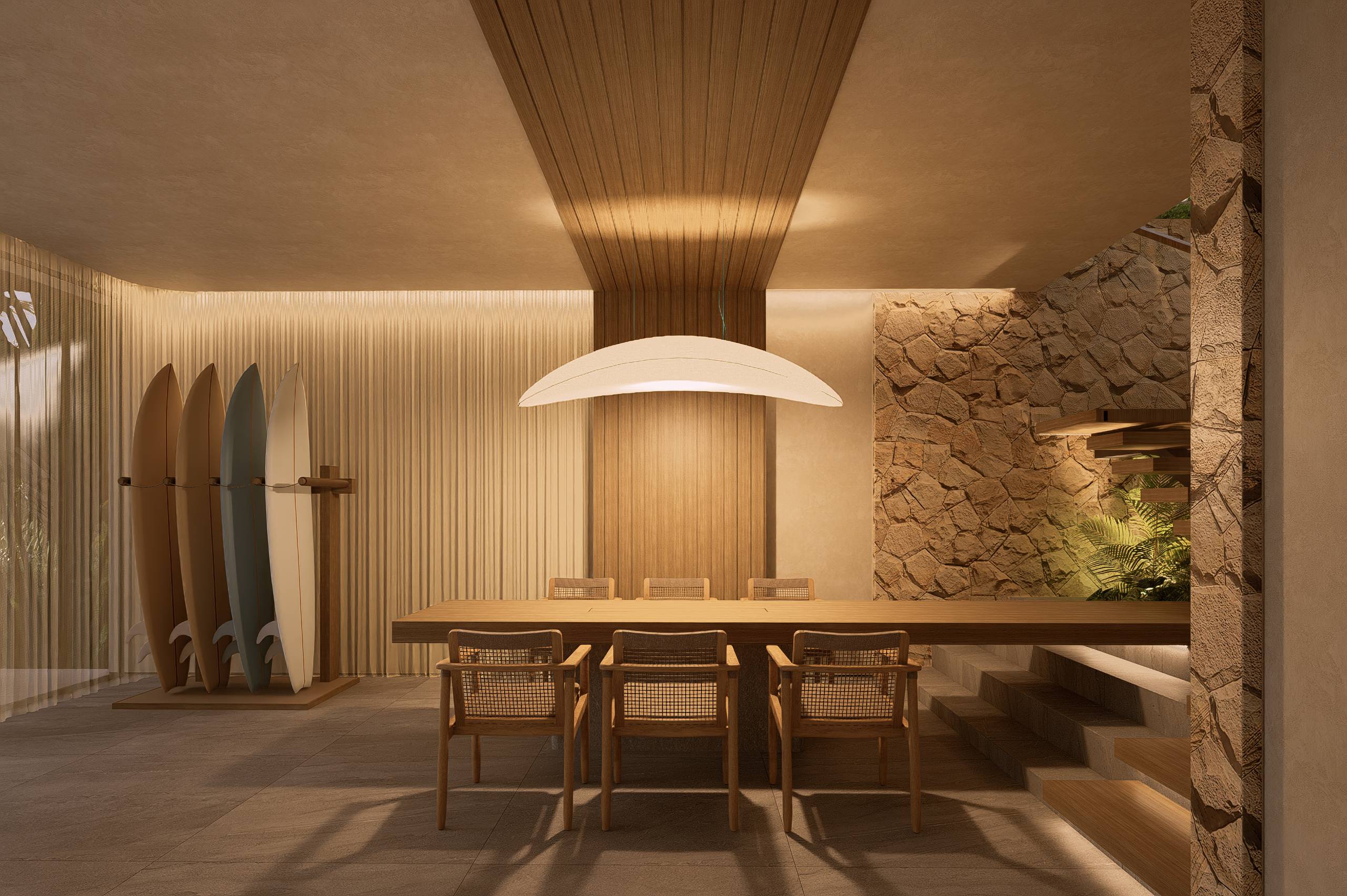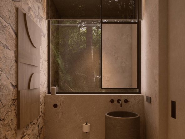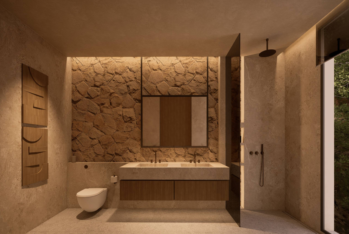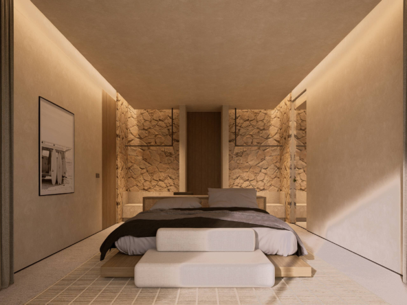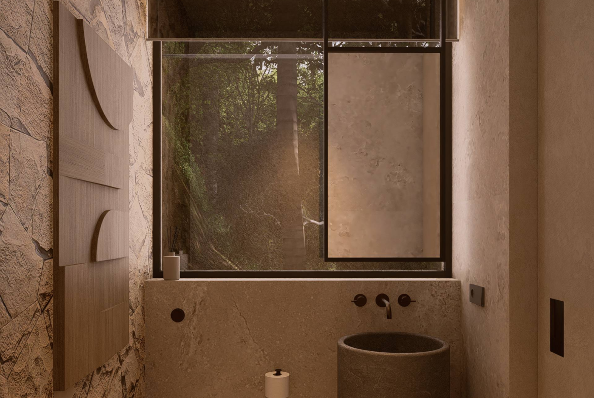 The material palette draws from Bali’s most compelling elements: volcanic stone for strength, polished concrete for modern edge, timber for warmth, and expansive glass to frame the horizon. Every detail is purposeful, creating a sanctuary that feels both grounded and aspirational.
