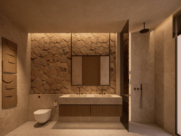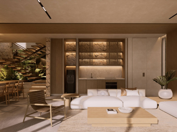Spread across two beautifully designed levels, the villas offer an open-plan living space that seamlessly extends to a private infinity pool and outdoor terrace. This fluid layout encourages daily relaxation, sunset gatherings, and a lifestyle anchored in the area’s dramatic natural surroundings. Two elevated ensuite bedrooms sit above with private terraces, inviting sunrise light and evening coastal breezes. A third ensuite bedroom offers additional privacy, ideal for guests or family.