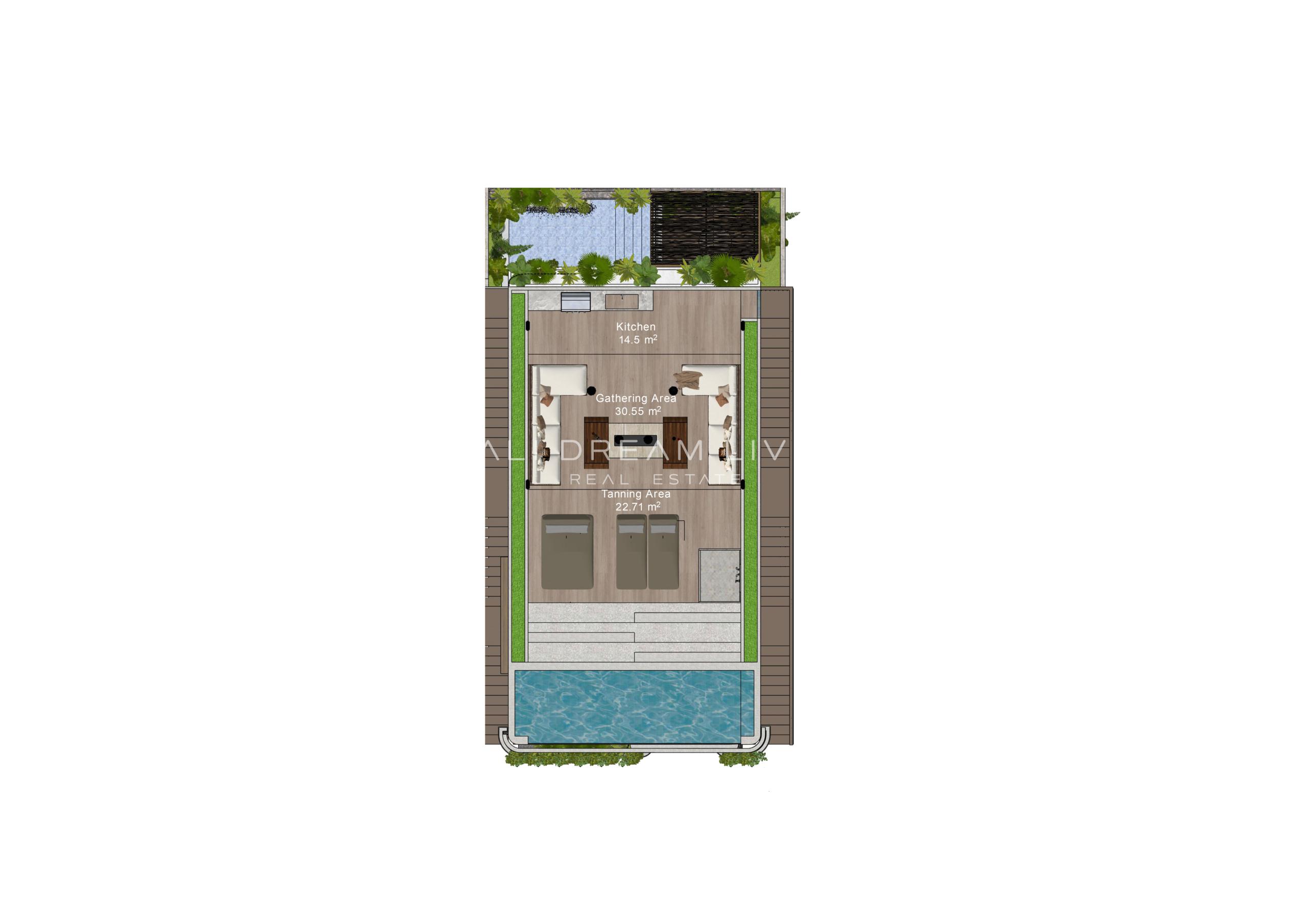 The villa offers multiple outdoor sanctuaries, including a private ground-level pool and patio, perfect for unwinding in style, and a second rooftop infinity pool with breathtaking panoramic ocean views. A rooftop kitchen enhances the villa’s entertainment capabilities, providing a perfect space for hosting unforgettable evenings under the stars.