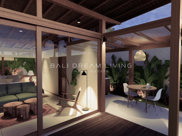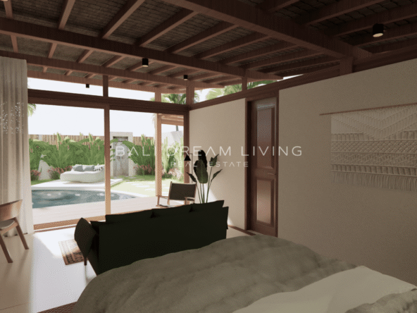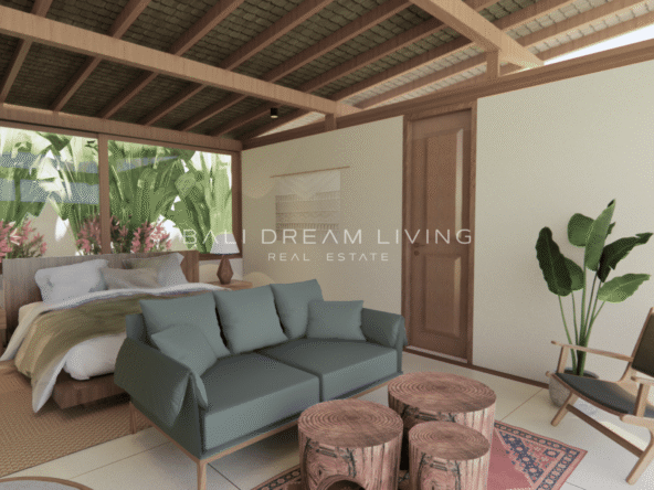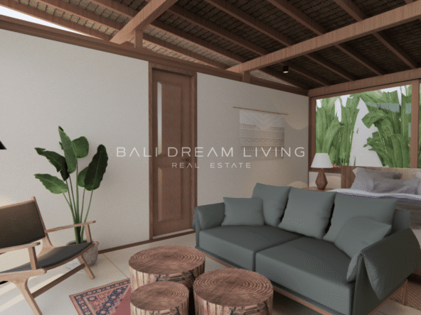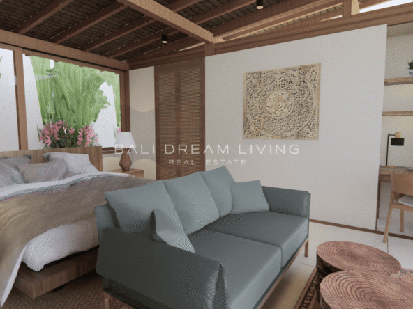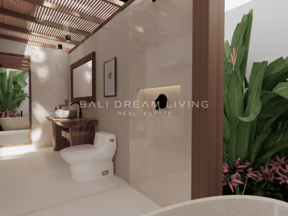 The modern en-suite bathroom complements the villa’s design, ensuring a comfortable and luxurious living experience. This property combines a prime location with peaceful surroundings, making it an ideal choice for a personal retreat or an investment opportunity in Bali.